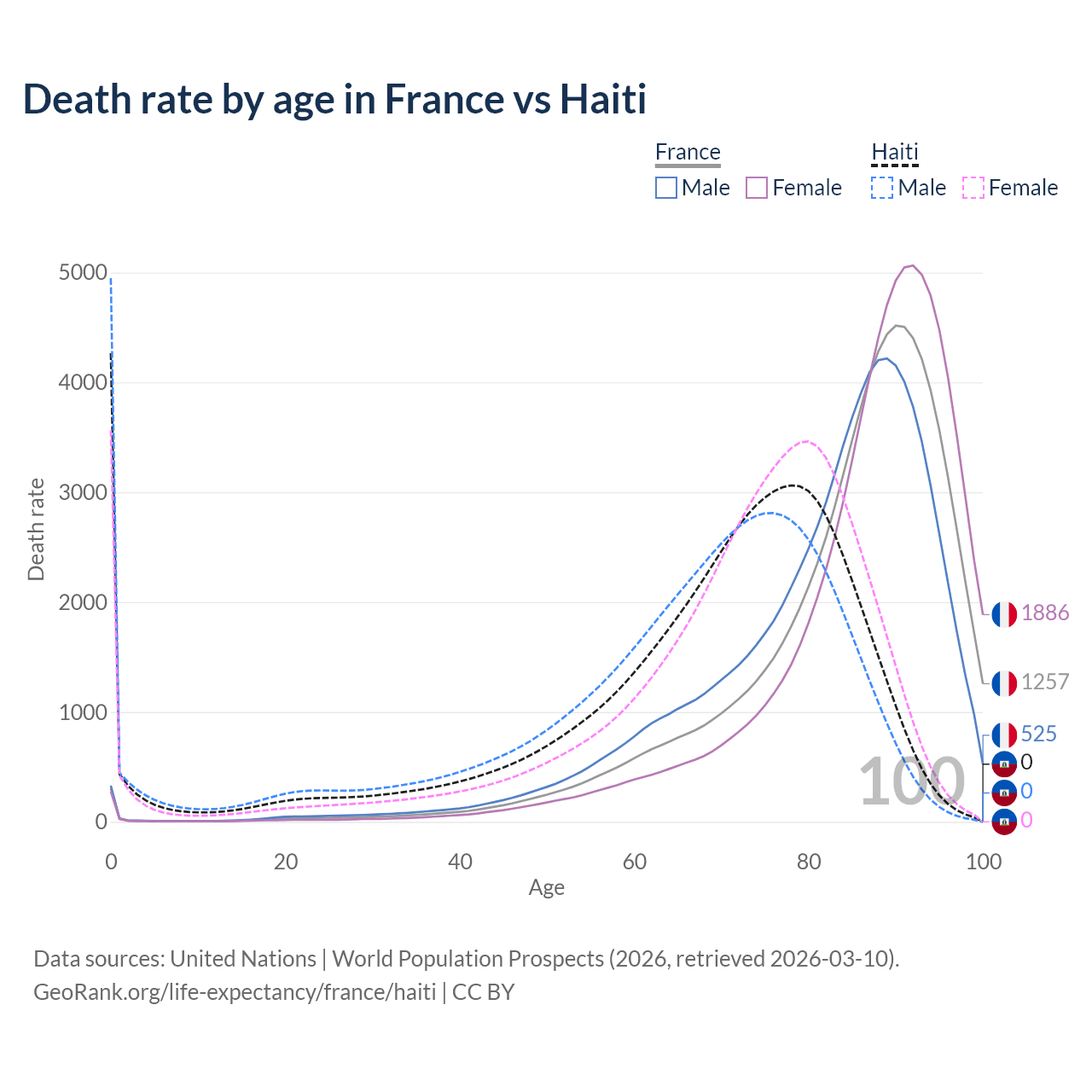 The average life expectancy at birth is 83.7 years in France vs 65.5 in Haiti. France is ranked 15/197 by life expectancy, and Haiti is 170/197. In France, the life expectancy is 80.9 years for males and 86.4 years for females. In Haiti, it's 62.2 years for males and 68.8 years for females.