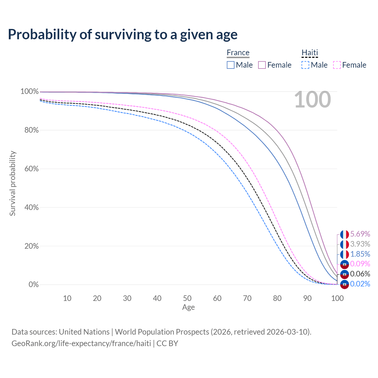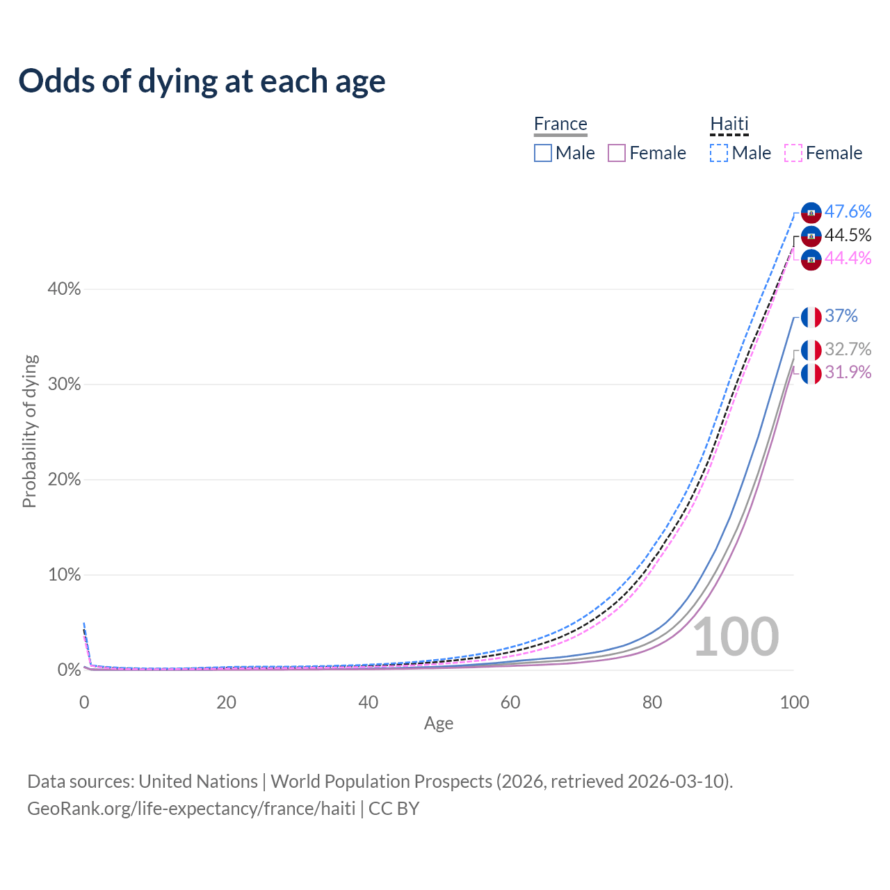 This life expectancy calculator shows the odds of living to 100, 95, 90, and below based on current age for both males and females in France and Haiti, along with mean and median age of death. The calculations are based on the 2026 life tables (actuarial tables) from the UN World Population Prospects.