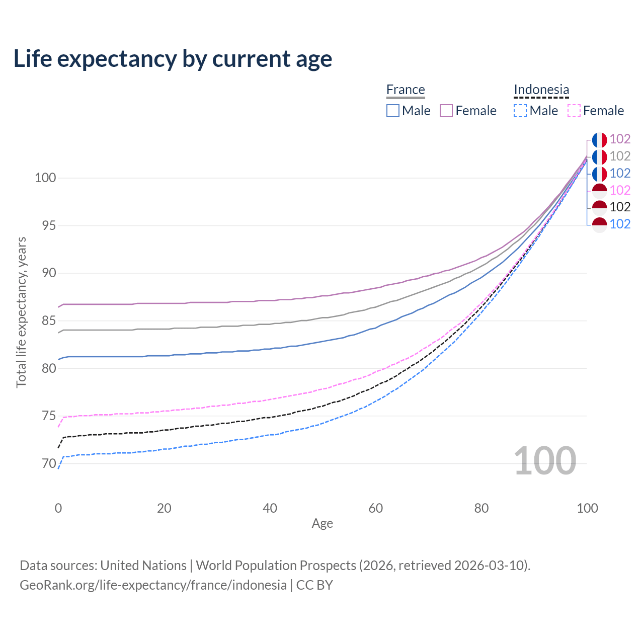 This life expectancy calculator shows the odds of living to 100, 95, 90, and below based on current age for both males and females in France and Indonesia, along with mean and median age of death. The calculations are based on the 2026 life tables (actuarial tables) from the UN World Population Prospects.