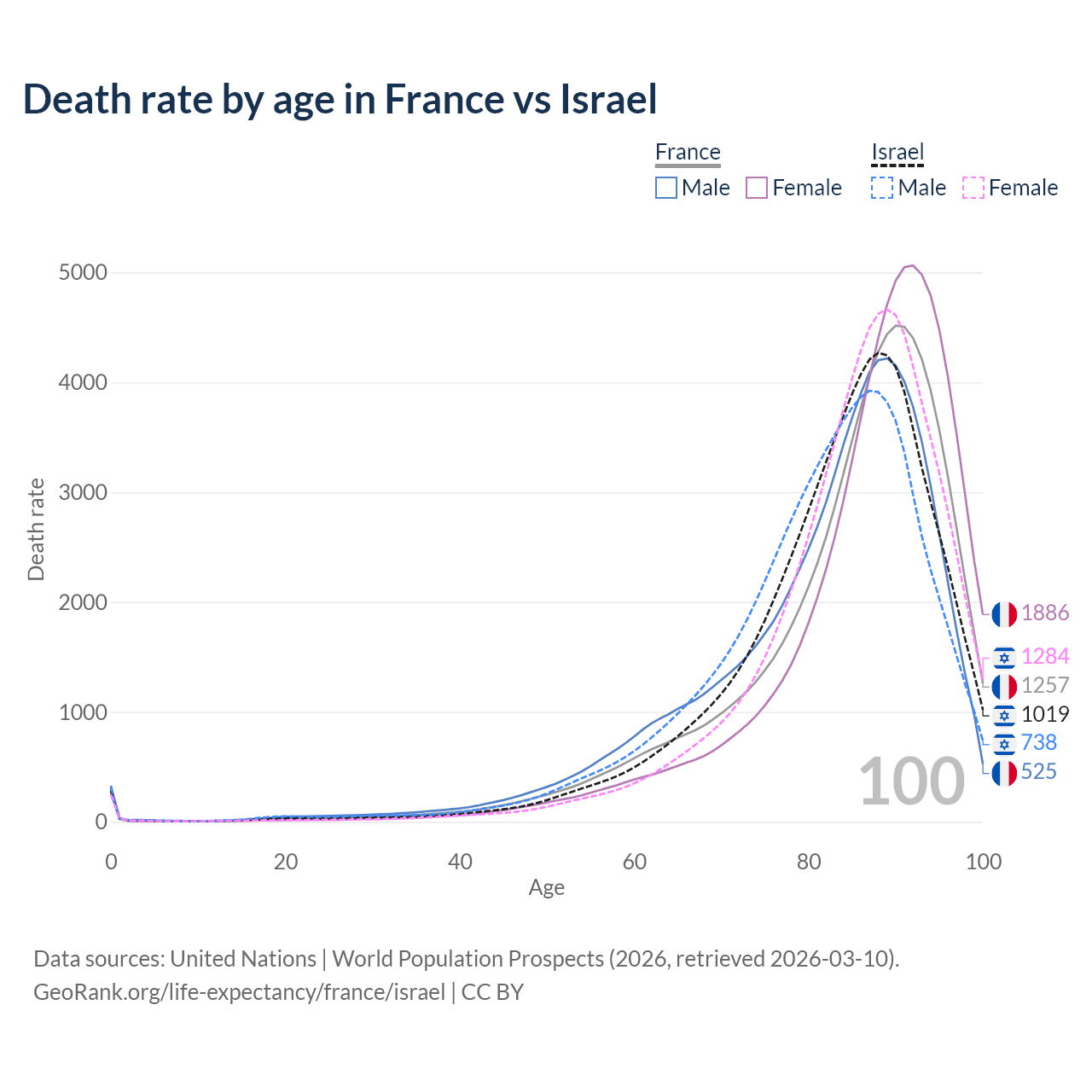 In France, the most common age of death is 90, compared to 88 in Israel. The median age of death is 87.4 in France and 85.6 in Israel, meaning only half of each cohort is expected to live past that age.