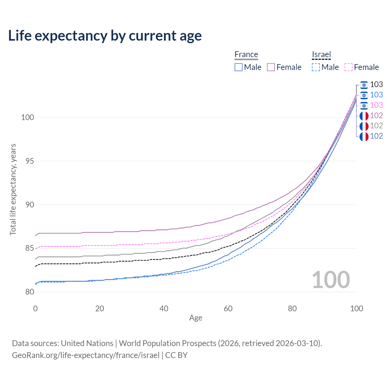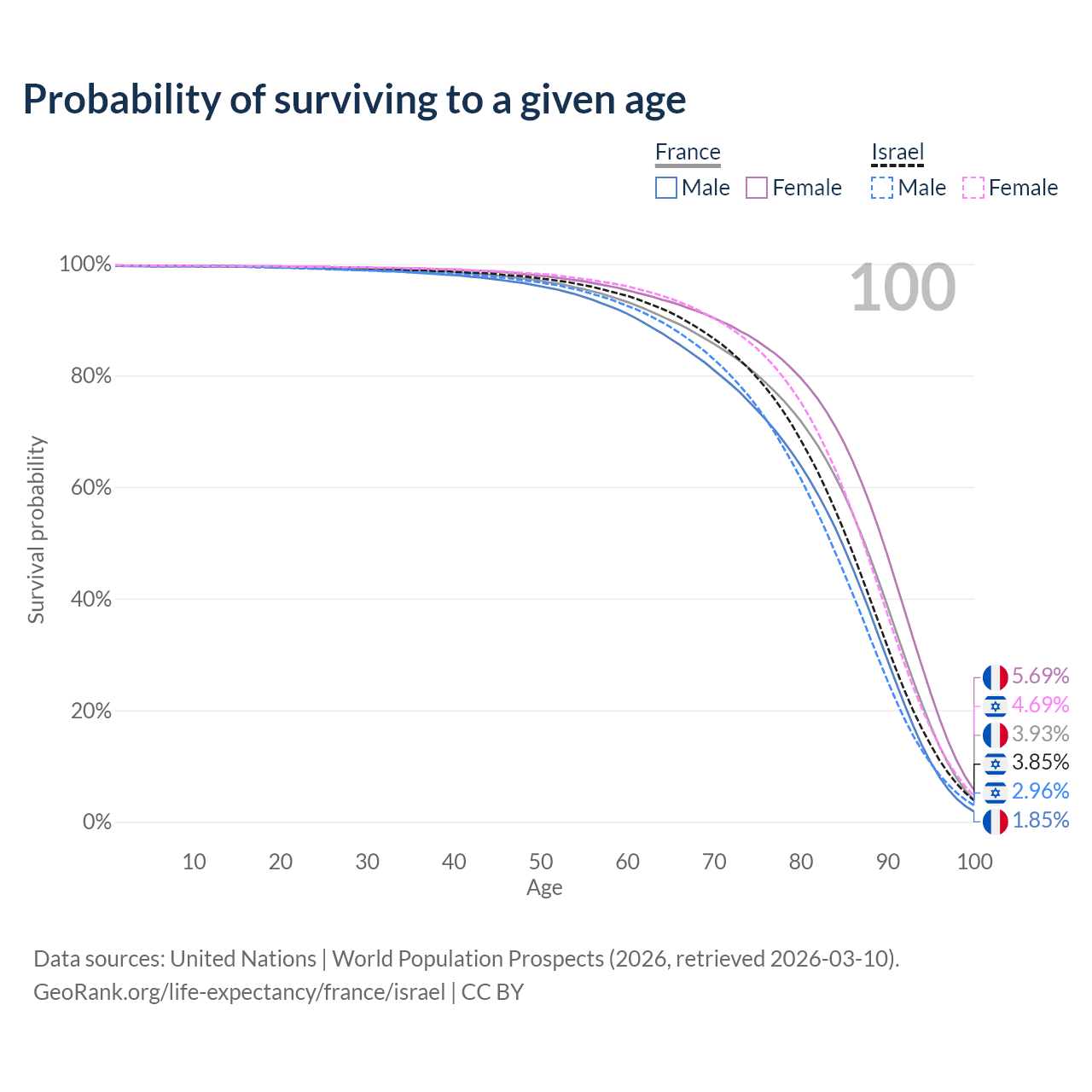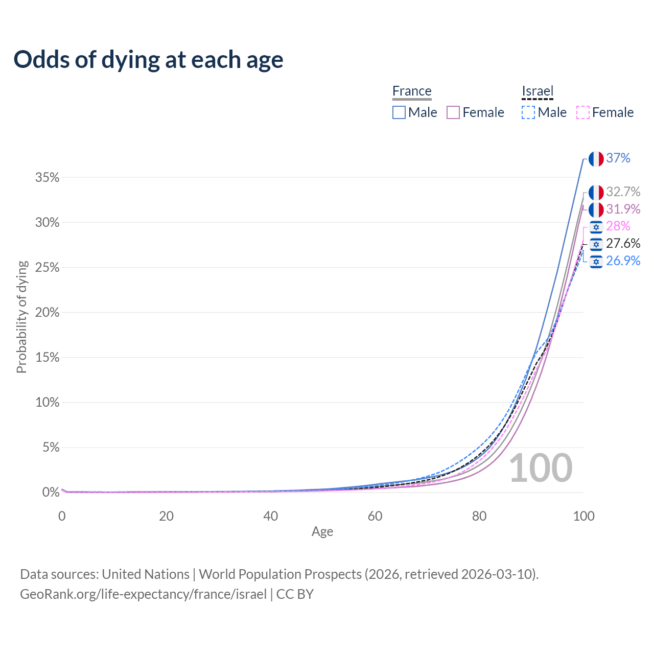 This life expectancy calculator shows the odds of living to 100, 95, 90, and below based on current age for both males and females in France and Israel, along with mean and median age of death. The calculations are based on the 2026 life tables (actuarial tables) from the UN World Population Prospects.