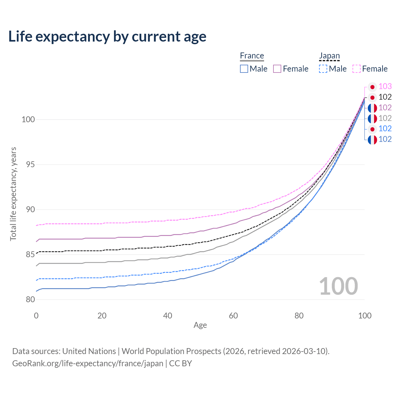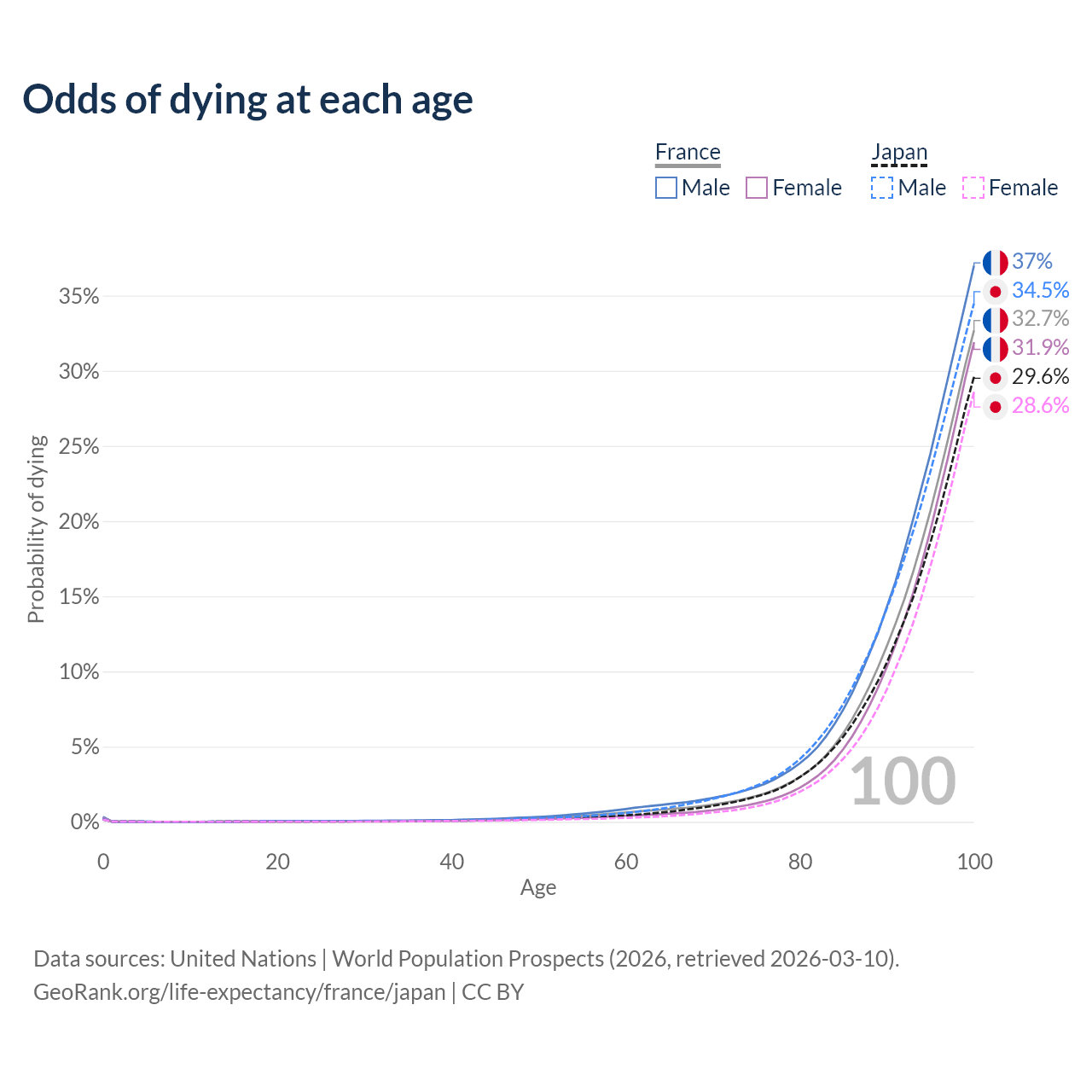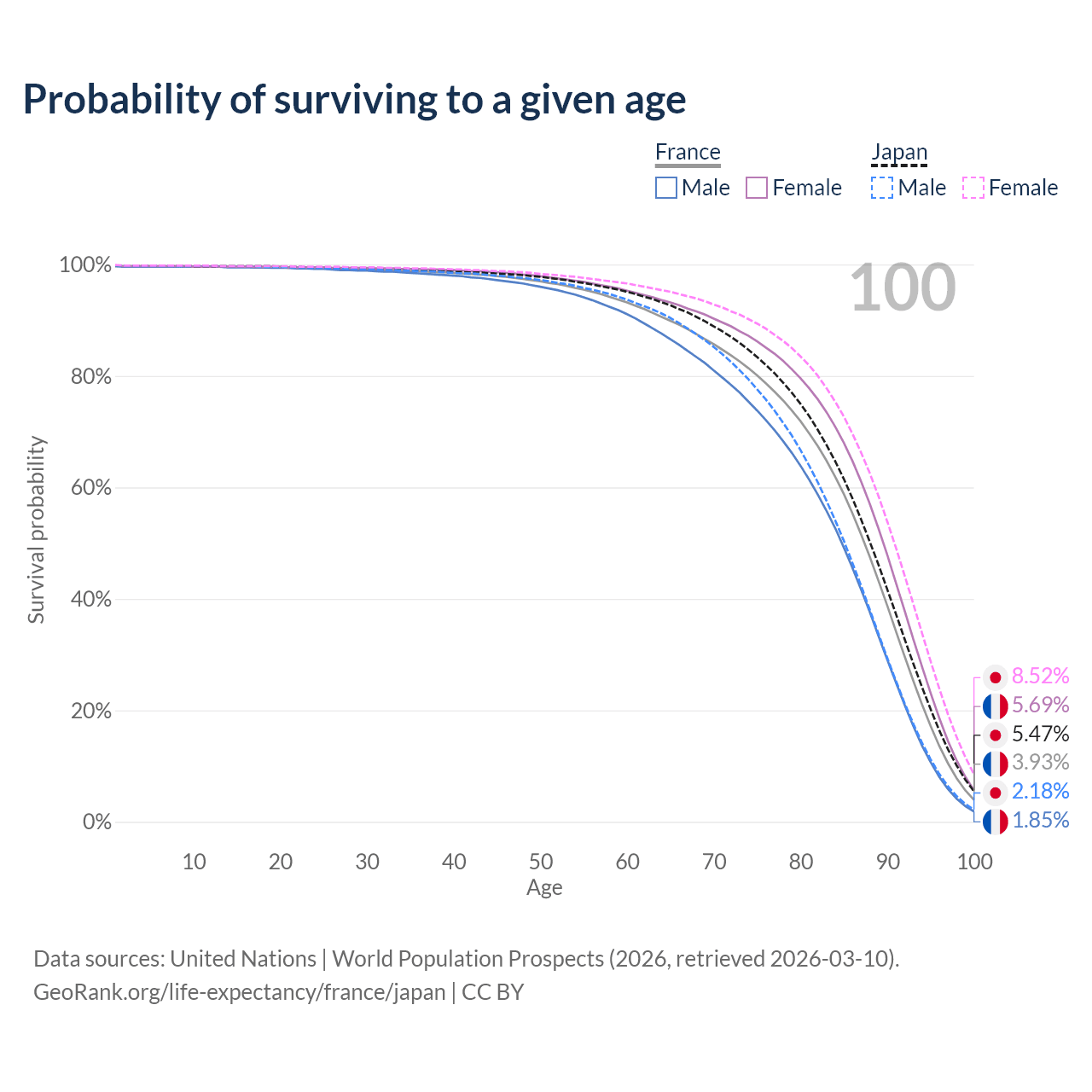 This life expectancy calculator shows the odds of living to 100, 95, 90, and below based on current age for both males and females in France and Japan, along with mean and median age of death. The calculations are based on the 2026 life tables (actuarial tables) from the UN World Population Prospects.