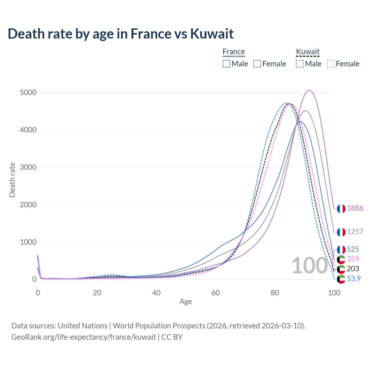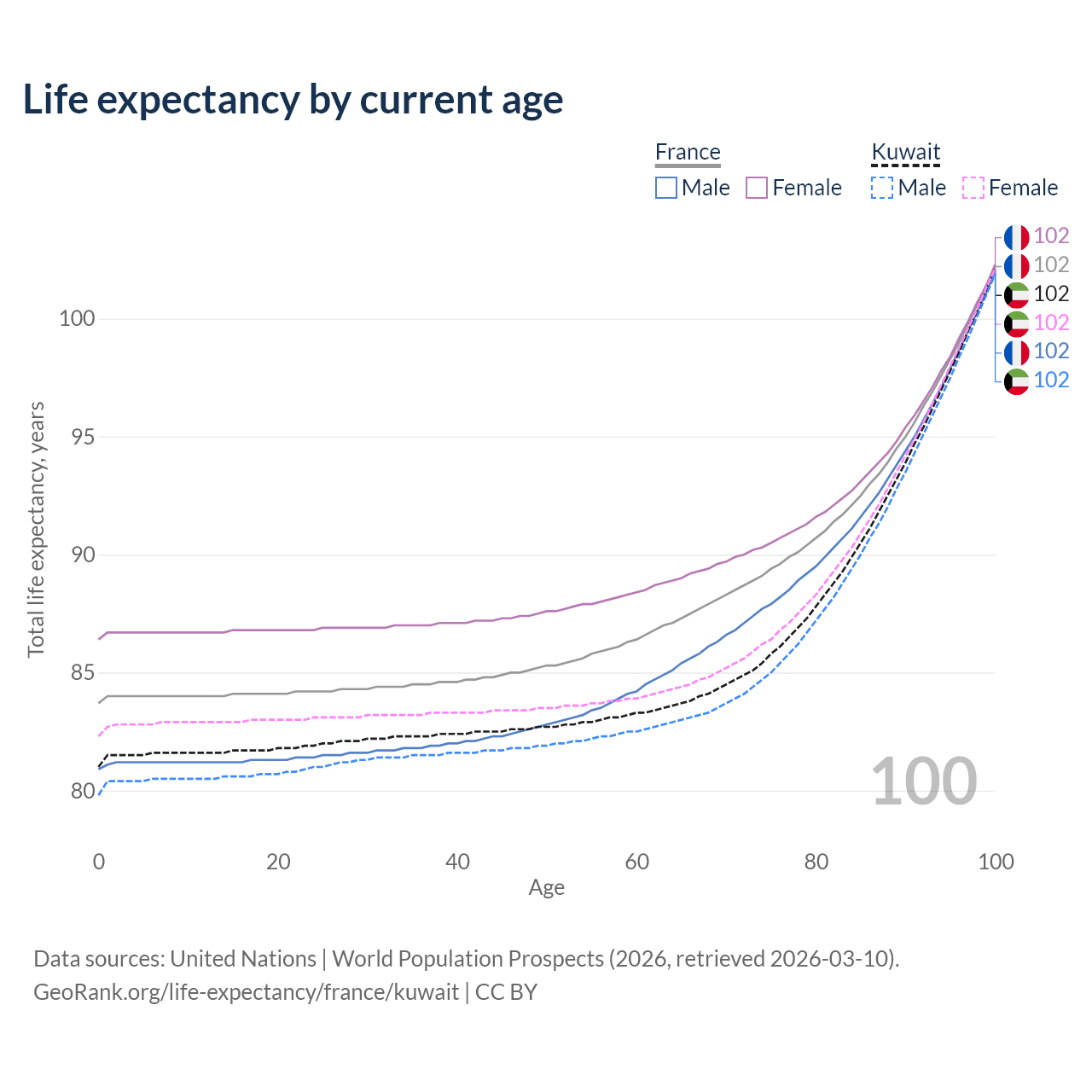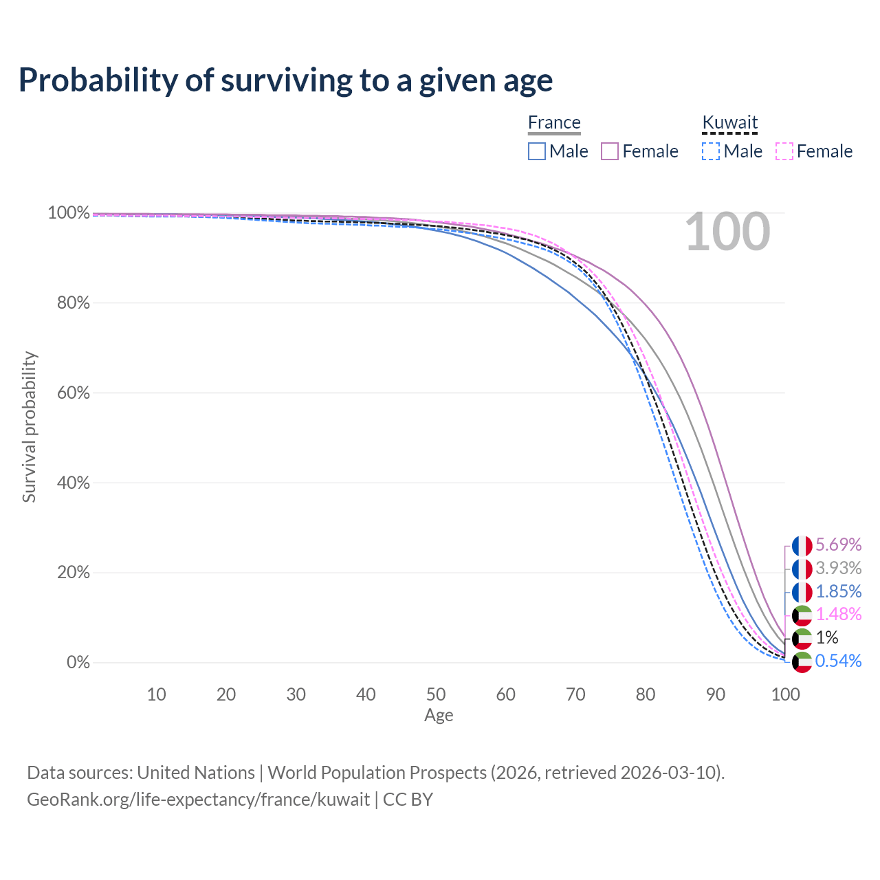 This life expectancy calculator shows the odds of living to 100, 95, 90, and below based on current age for both males and females in France and Kuwait, along with mean and median age of death. The calculations are based on the 2026 life tables (actuarial tables) from the UN World Population Prospects.