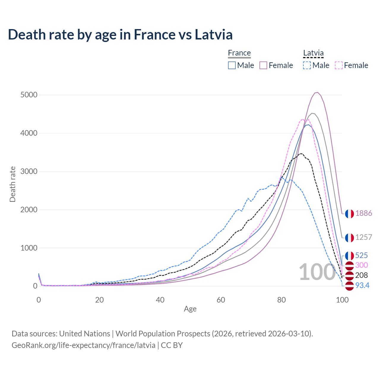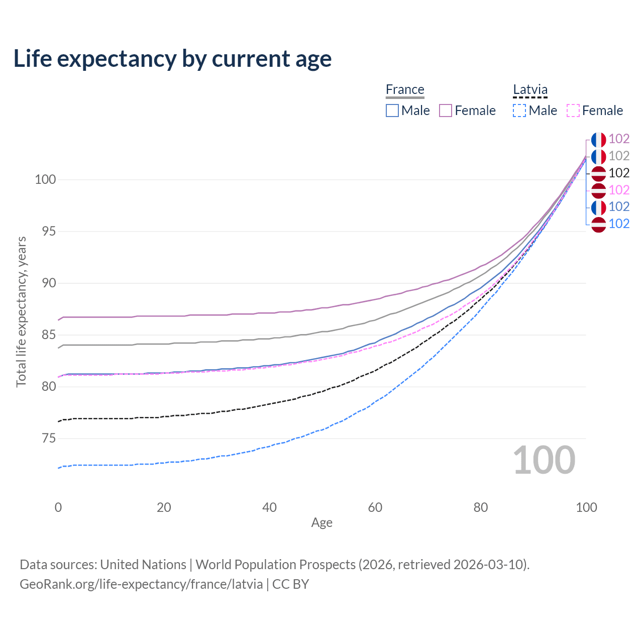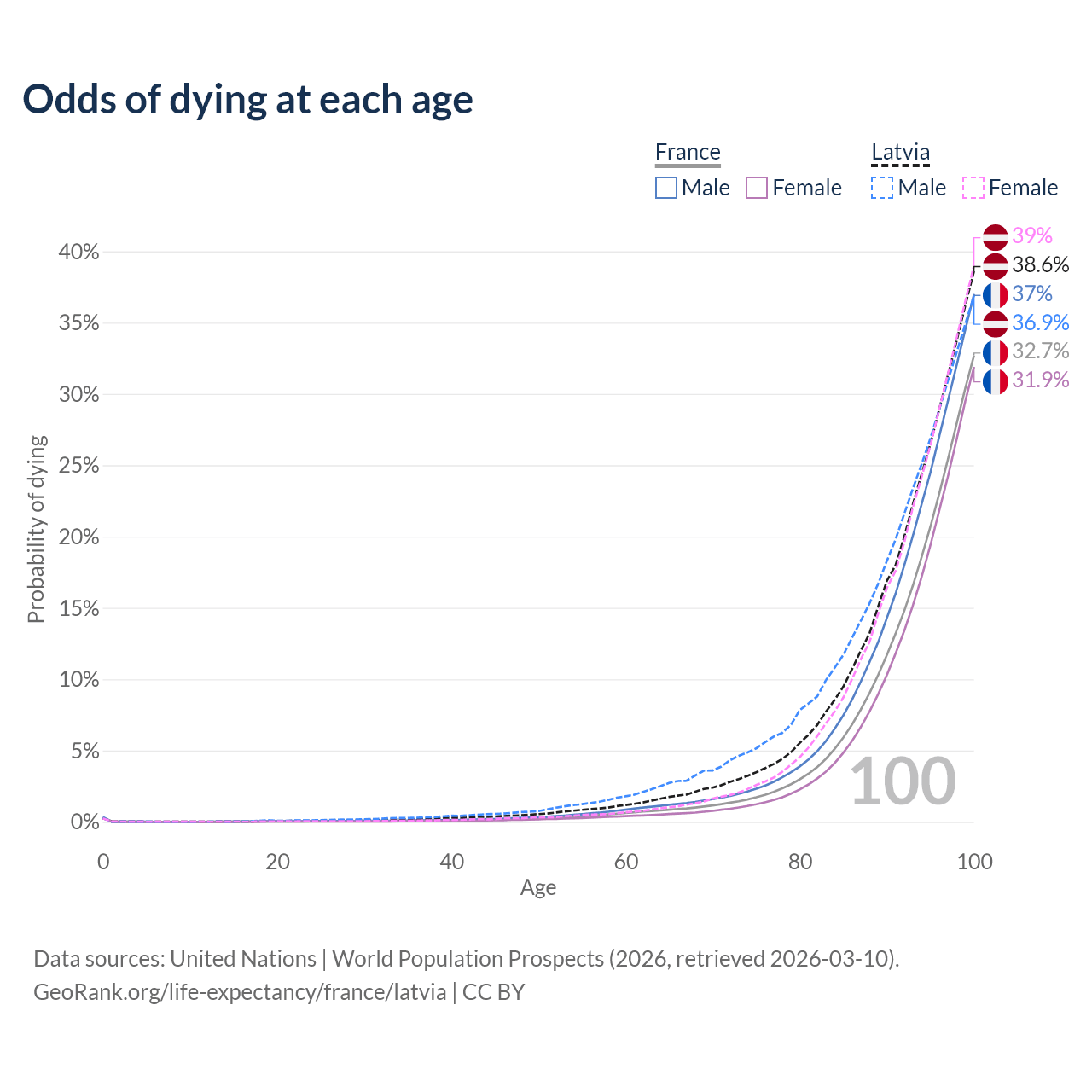 This life expectancy calculator shows the odds of living to 100, 95, 90, and below based on current age for both males and females in France and Latvia, along with mean and median age of death. The calculations are based on the 2026 life tables (actuarial tables) from the UN World Population Prospects.