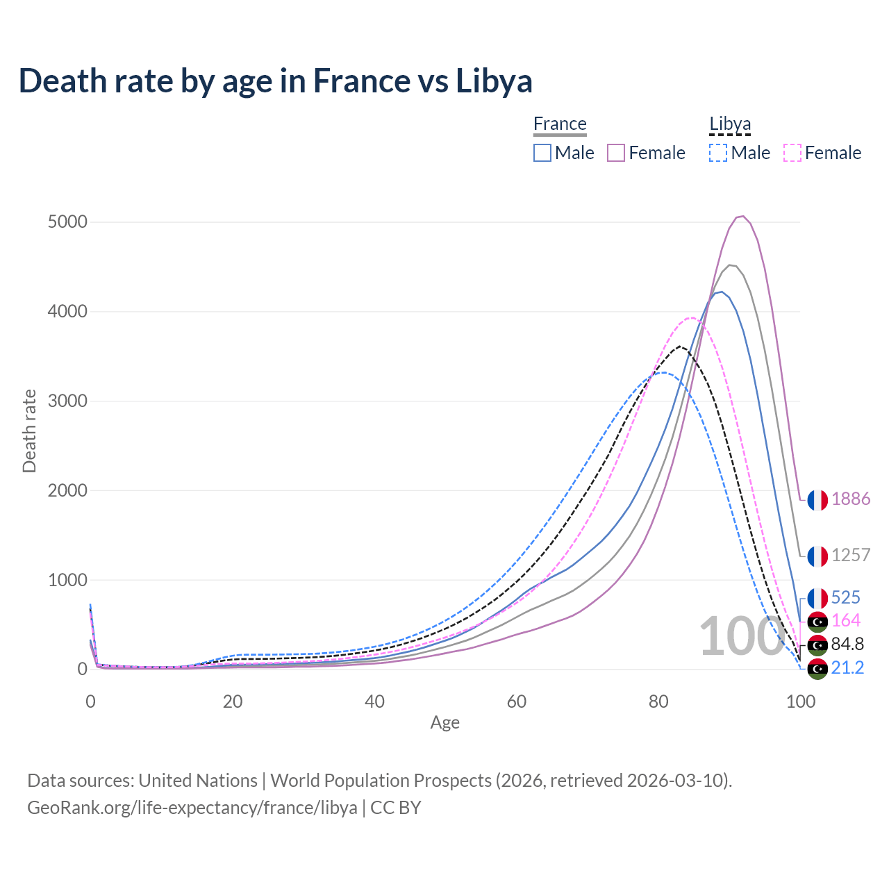 In France, the most common age of death is 90, compared to 83 in Libya. The median age of death is 87.4 in France and 78.8 in Libya, meaning only half of each cohort is expected to live past that age.