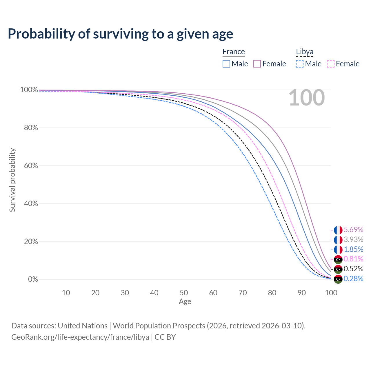 This life expectancy calculator shows the odds of living to 100, 95, 90, and below based on current age for both males and females in France and Libya, along with mean and median age of death. The calculations are based on the 2026 life tables (actuarial tables) from the UN World Population Prospects.