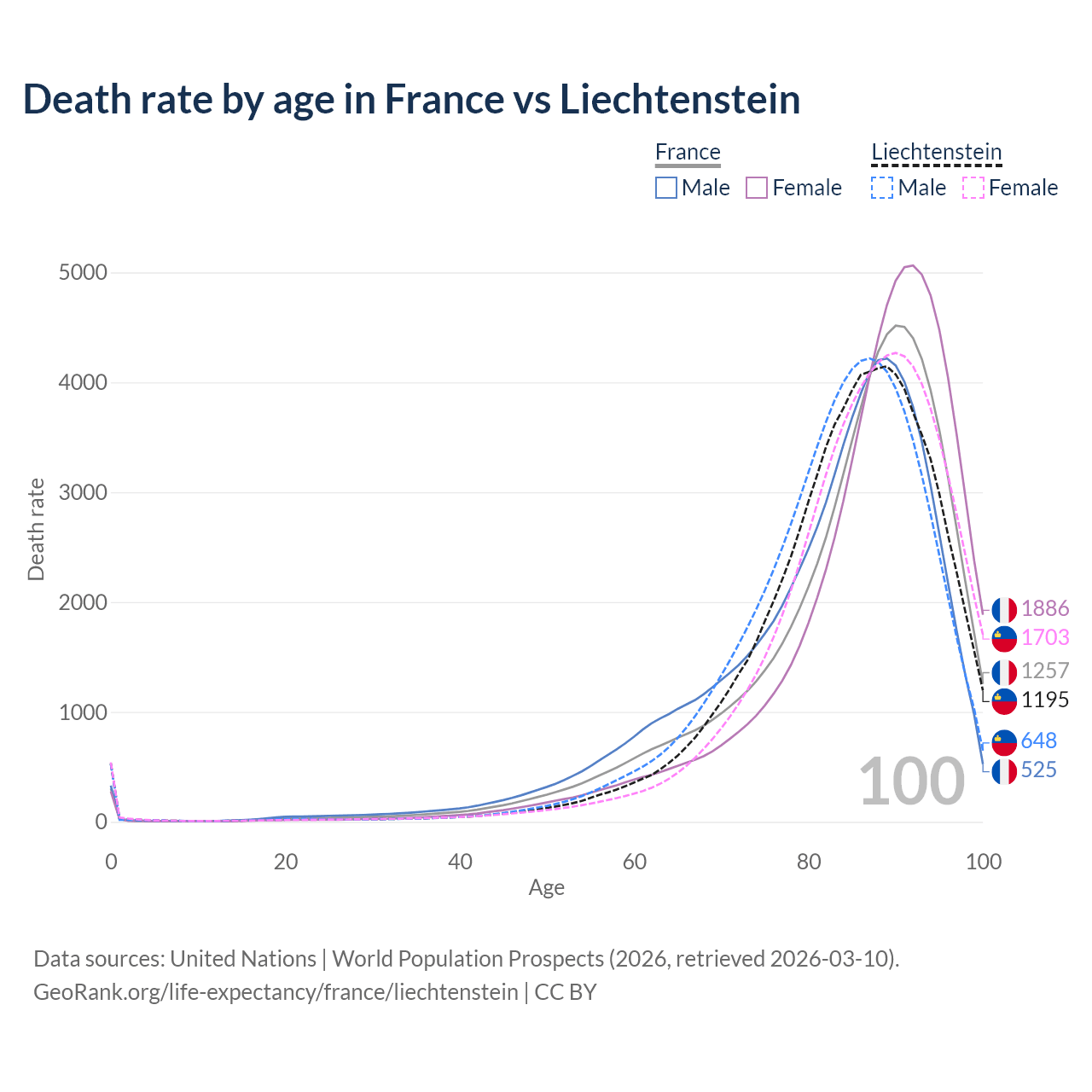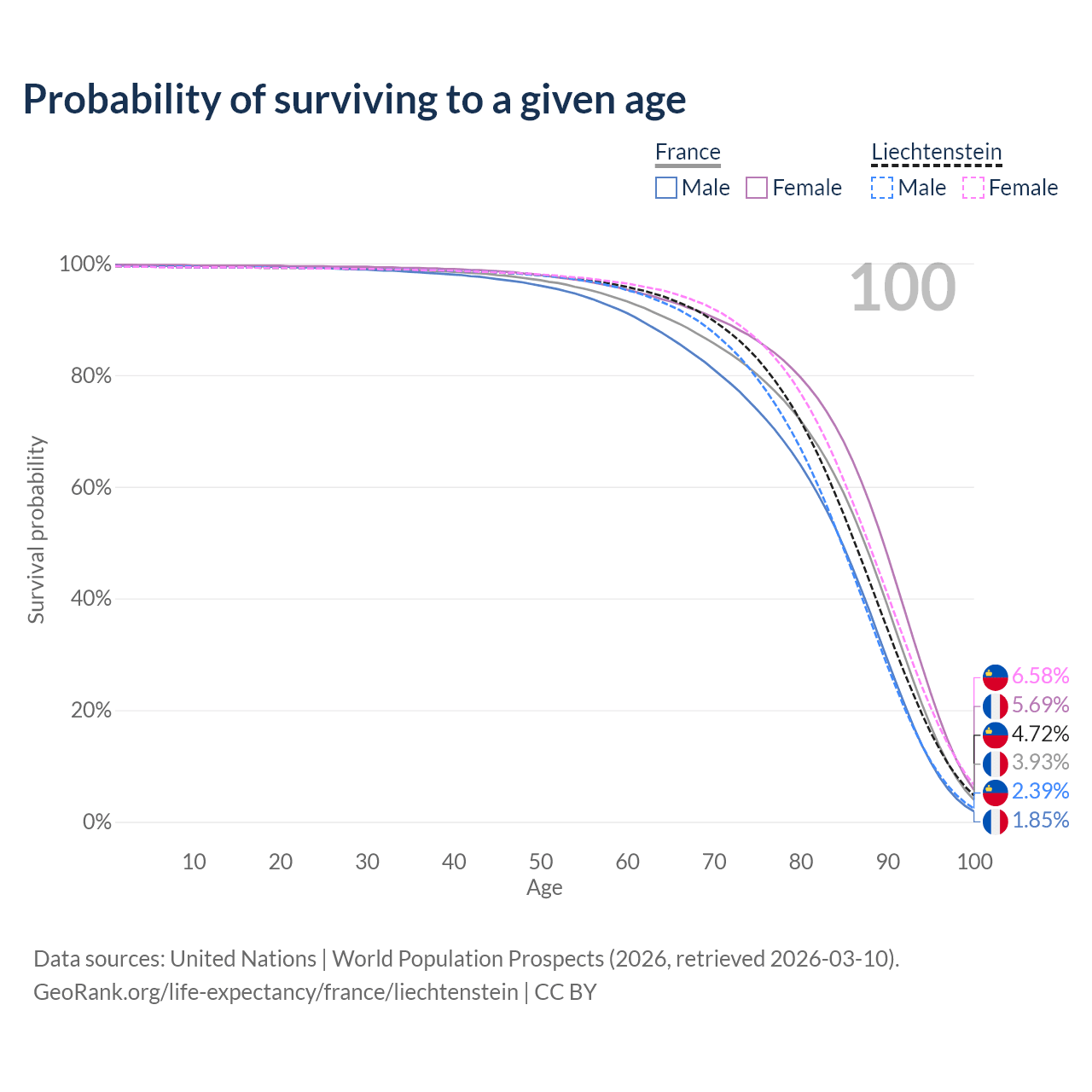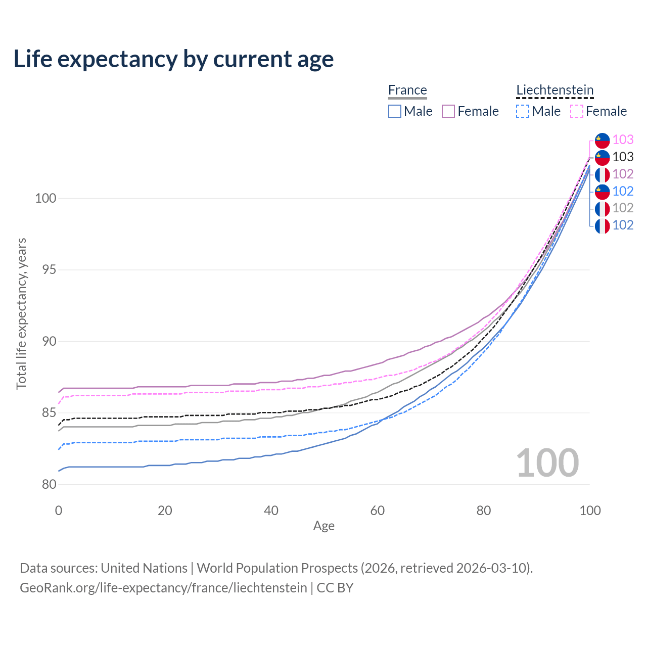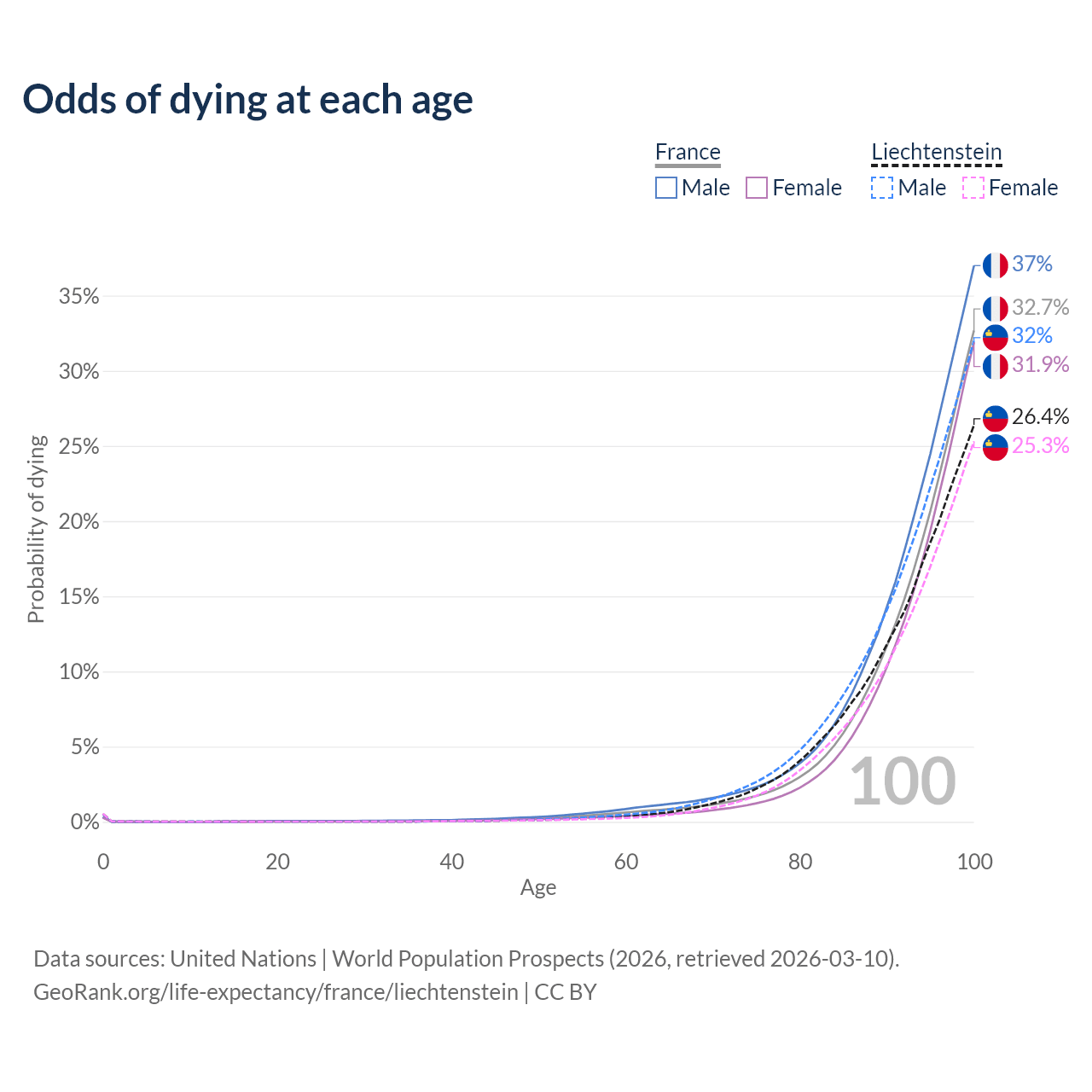 This life expectancy calculator shows the odds of living to 100, 95, 90, and below based on current age for both males and females in France and Liechtenstein, along with mean and median age of death. The calculations are based on the 2026 life tables (actuarial tables) from the UN World Population Prospects.