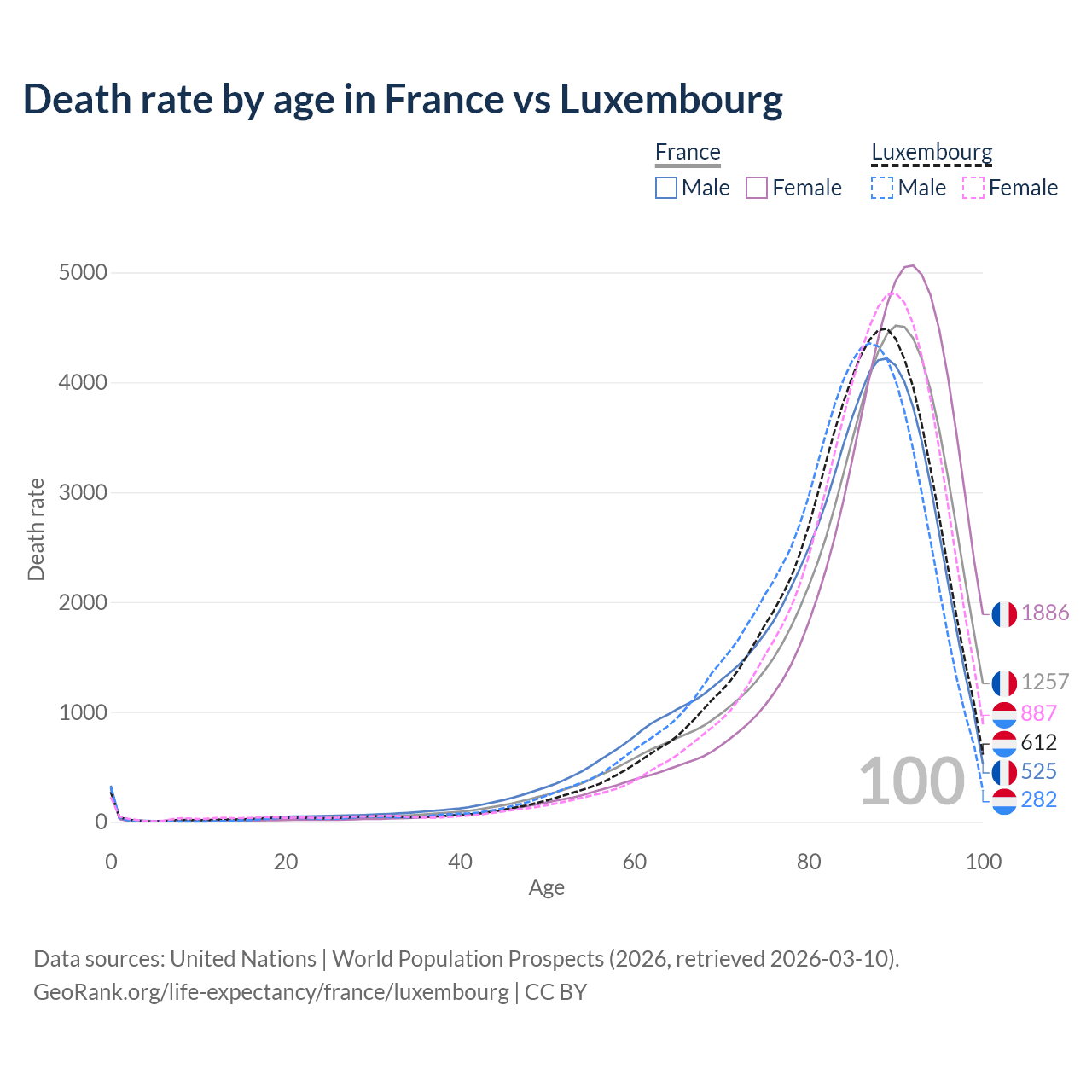 In France, the most common age of death is 90, compared to 89 in Luxembourg. The median age of death is 87.4 in France and 85.7 in Luxembourg, meaning only half of each cohort is expected to live past that age.