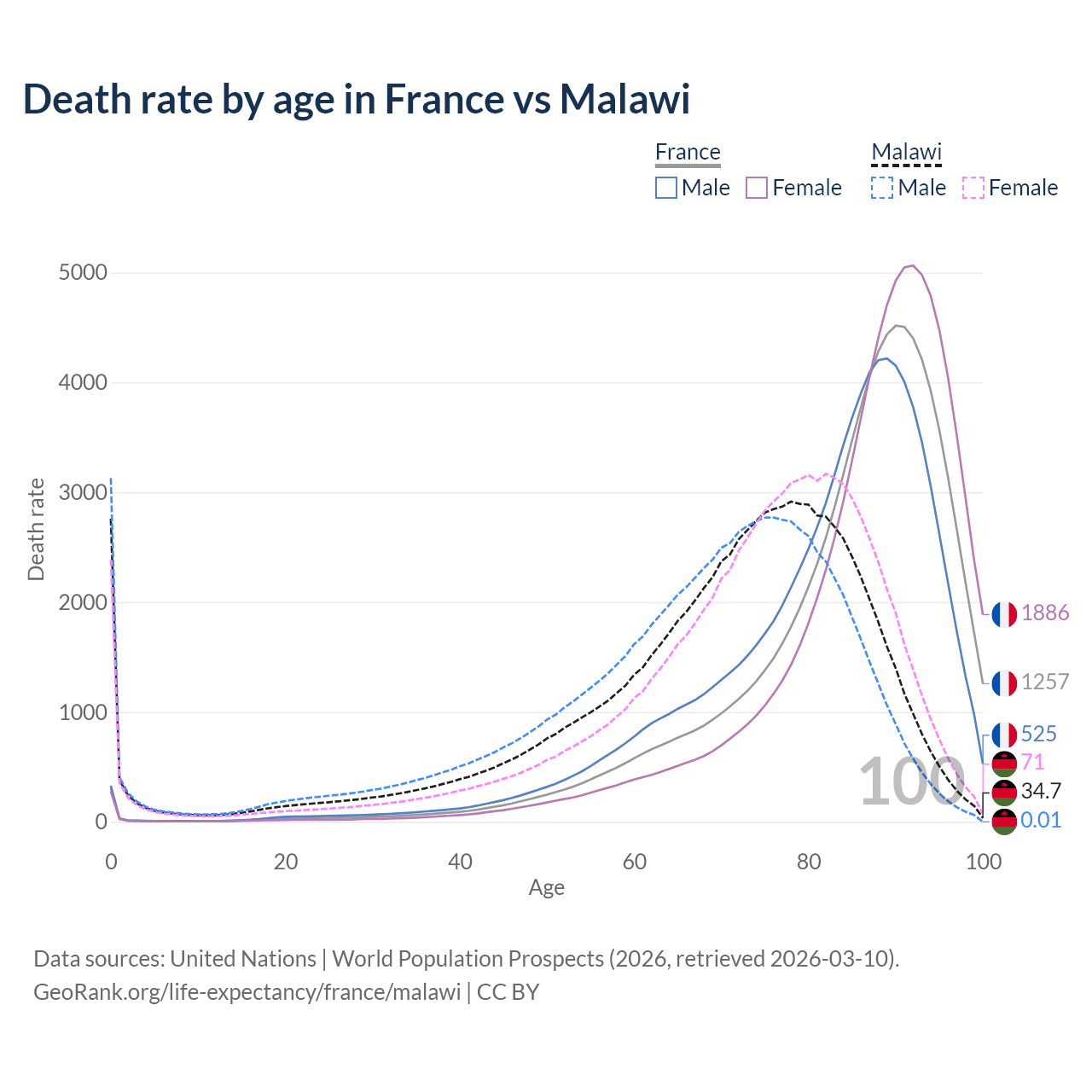 This life expectancy calculator shows the odds of living to 100, 95, 90, and below based on current age for both males and females in France and Malawi, along with mean and median age of death. The calculations are based on the 2026 life tables (actuarial tables) from the UN World Population Prospects.