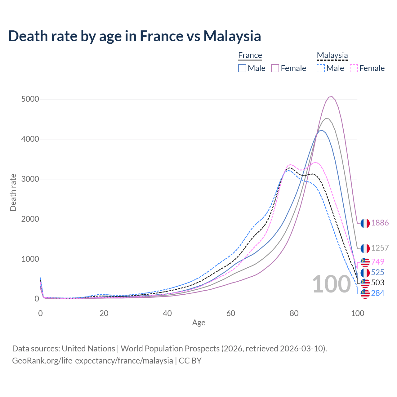 This life expectancy calculator shows the odds of living to 100, 95, 90, and below based on current age for both males and females in France and Malaysia, along with mean and median age of death. The calculations are based on the 2026 life tables (actuarial tables) from the UN World Population Prospects.