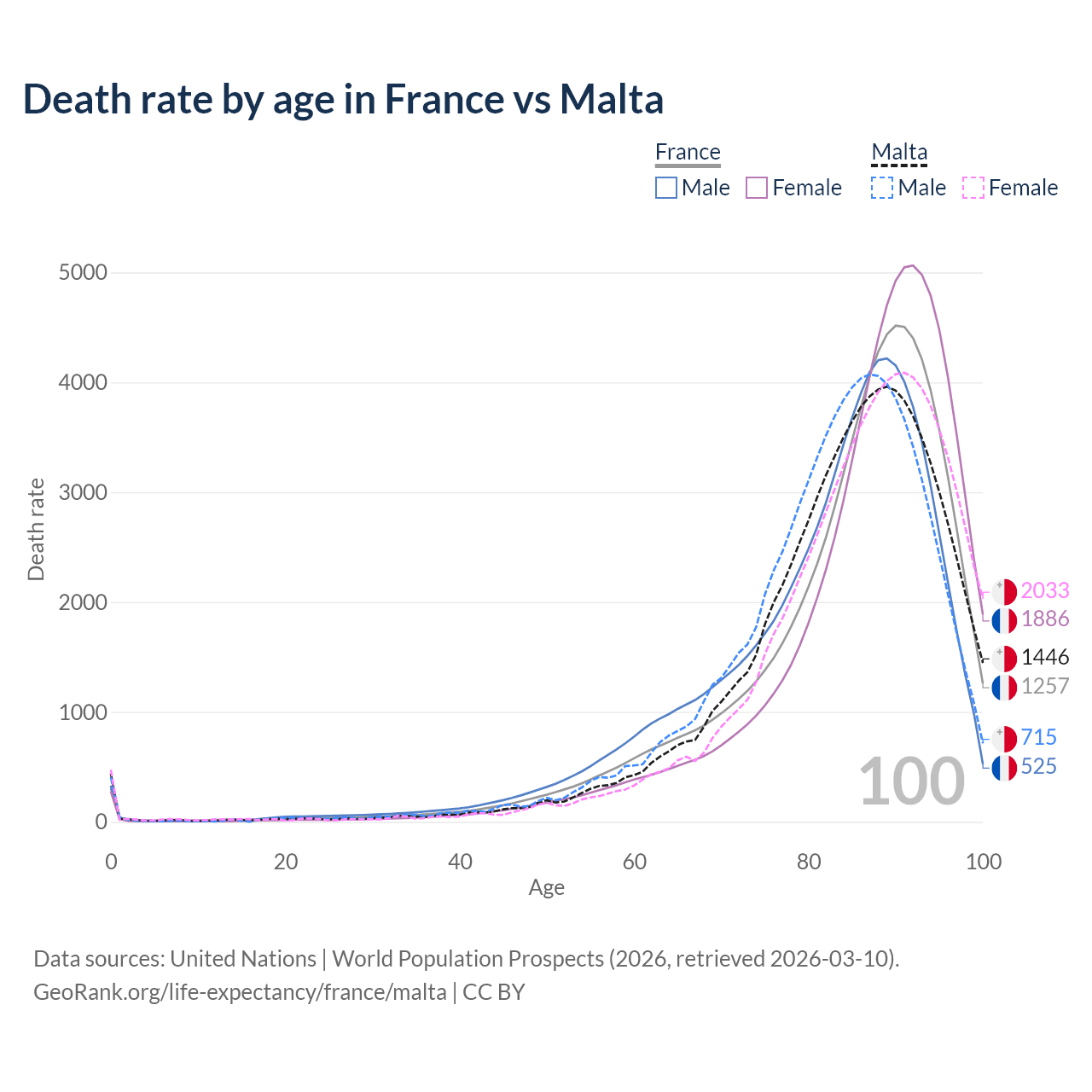 In France, the most common age of death is 90, compared to 89 in Malta. The median age of death is 87.4 in France and 86.3 in Malta, meaning only half of each cohort is expected to live past that age.