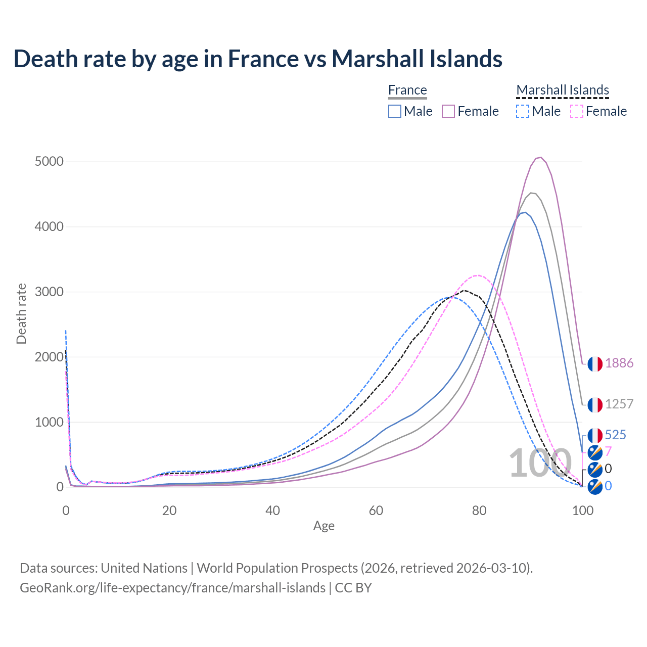 In France, the most common age of death is 90, compared to 77 in the Marshall Islands. The median age of death is 87.4 in France and 72 in the Marshall Islands, meaning only half of each cohort is expected to live past that age.
