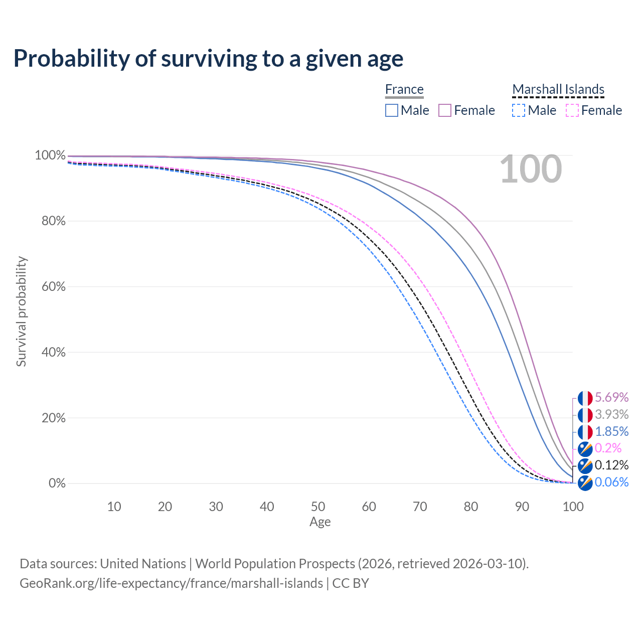 This life expectancy calculator shows the odds of living to 100, 95, 90, and below based on current age for both males and females in France and the Marshall Islands, along with mean and median age of death. The calculations are based on the 2026 life tables (actuarial tables) from the UN World Population Prospects.
