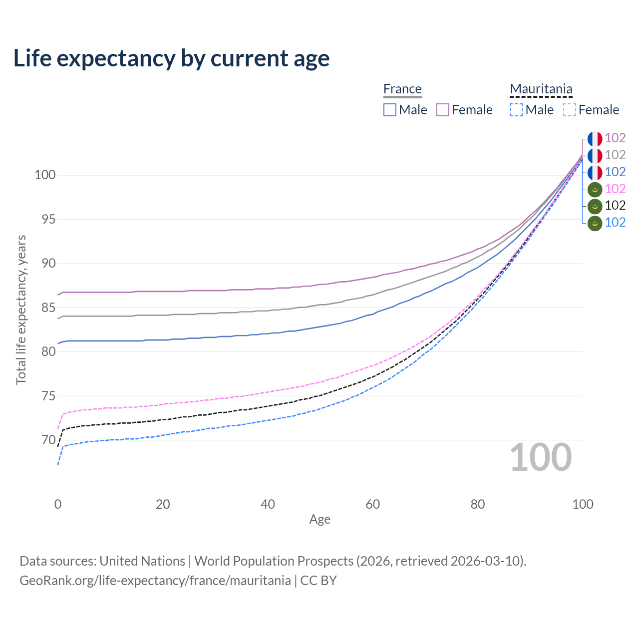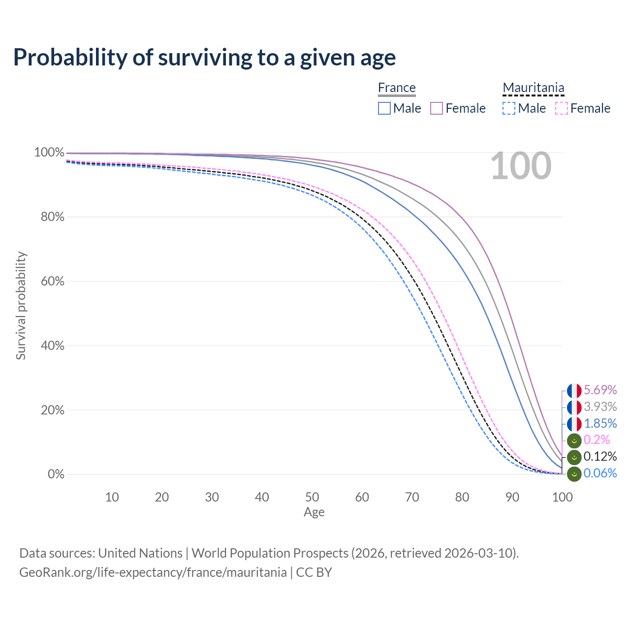 This life expectancy calculator shows the odds of living to 100, 95, 90, and below based on current age for both males and females in France and Mauritania, along with mean and median age of death. The calculations are based on the 2026 life tables (actuarial tables) from the UN World Population Prospects.