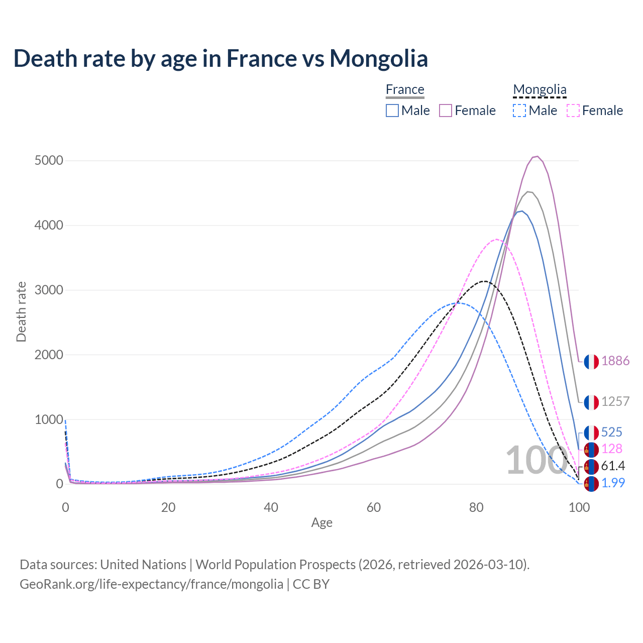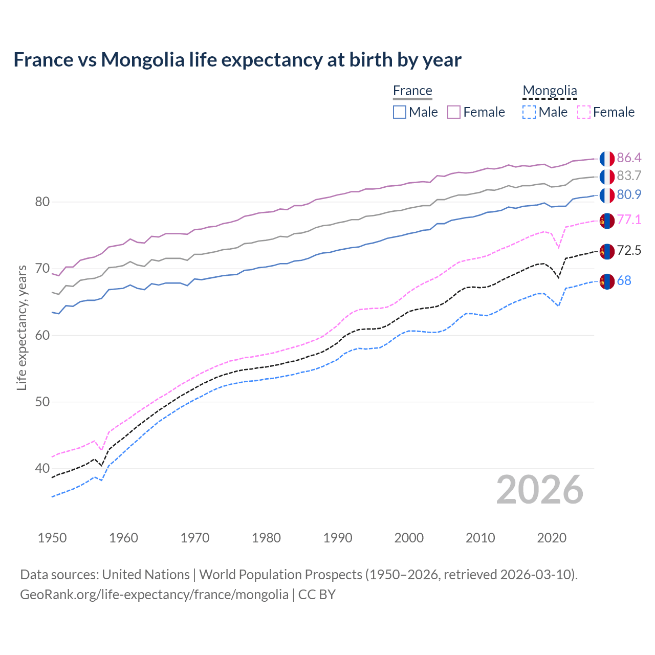 The average life expectancy at birth is 83.7 years in France vs 72.5 in Mongolia. France is ranked 15/197 by life expectancy, and Mongolia is 120/197. In France, the life expectancy is 80.9 years for males and 86.4 years for females. In Mongolia, it's 68 years for males and 77.1 years for females.