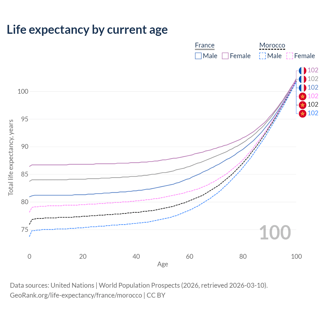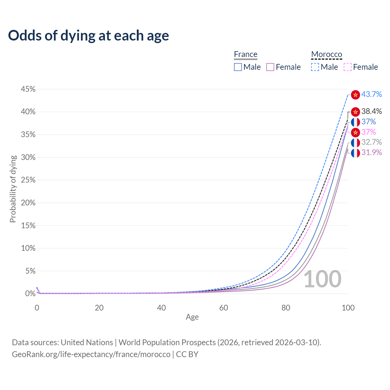 This life expectancy calculator shows the odds of living to 100, 95, 90, and below based on current age for both males and females in France and Morocco, along with mean and median age of death. The calculations are based on the 2026 life tables (actuarial tables) from the UN World Population Prospects.