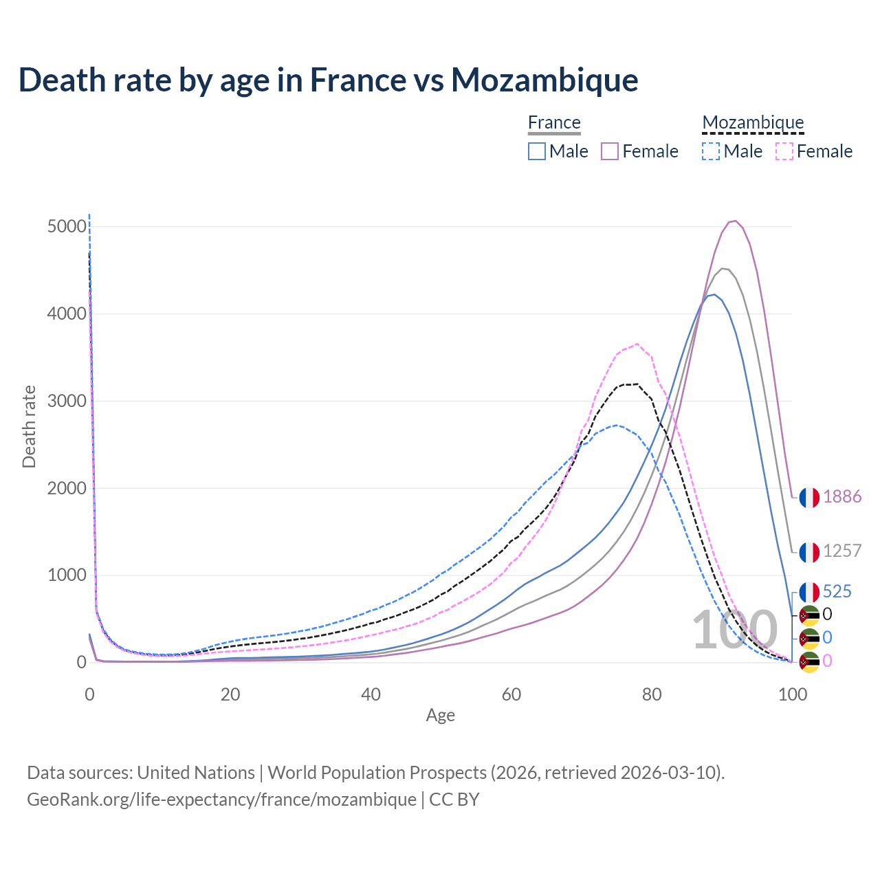 Note that this chart does not show rates per 100,000 population, as those would be skewed by age structure differences and reflect the demographics of France and Mozambique more than their death rates.