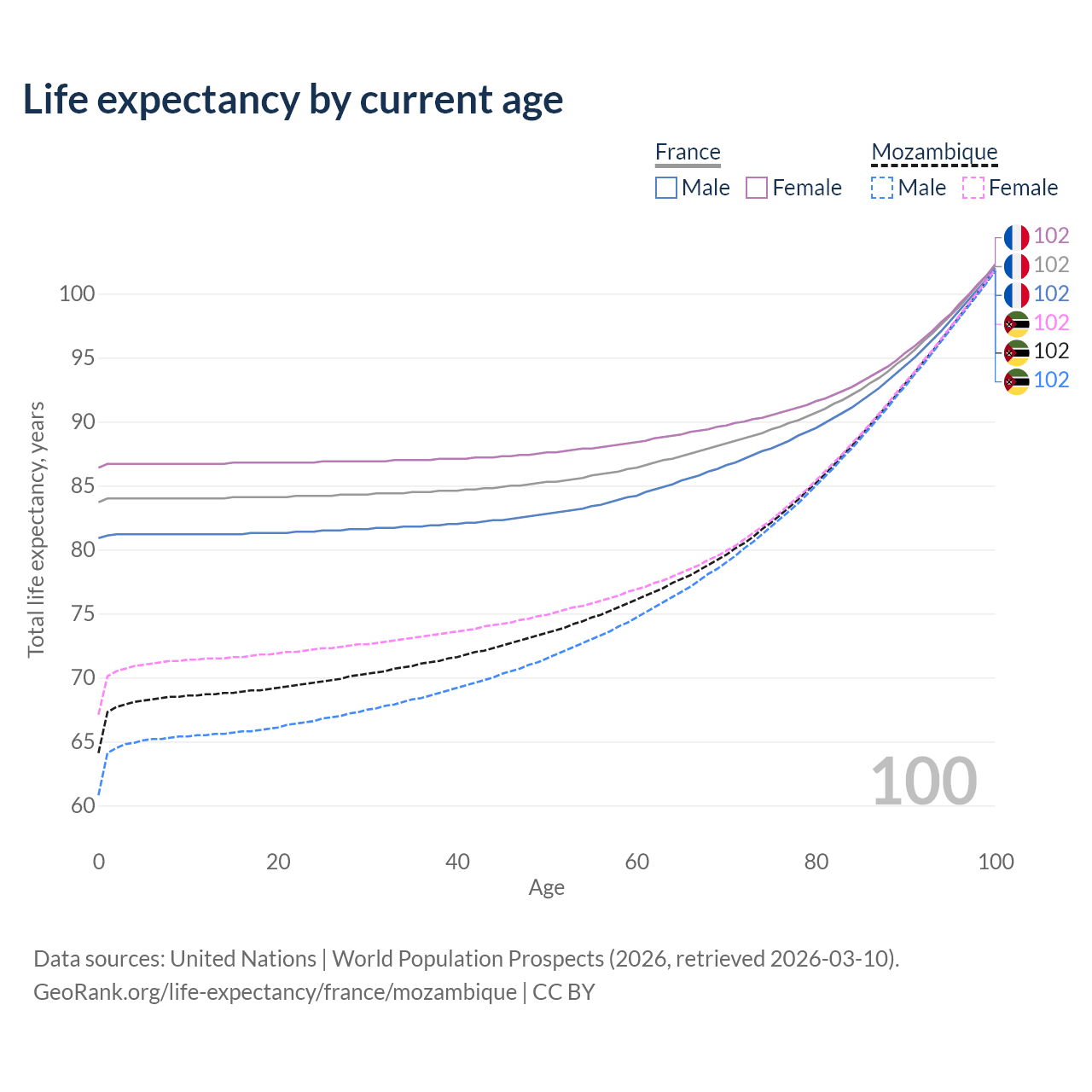 This life expectancy calculator shows the odds of living to 100, 95, 90, and below based on current age for both males and females in France and Mozambique, along with mean and median age of death. The calculations are based on the 2026 life tables (actuarial tables) from the UN World Population Prospects.