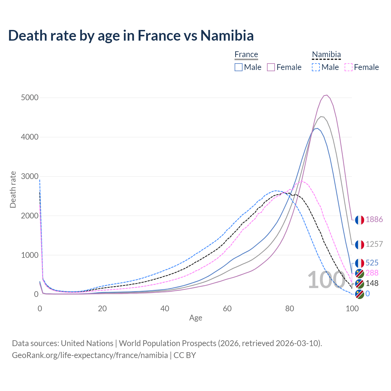 The average life expectancy at birth is 83.7 years in France vs 67.8 in Namibia. France is ranked 15/197 by life expectancy, and Namibia is 153/197. In France, the life expectancy is 80.9 years for males and 86.4 years for females. In Namibia, it's 63.7 years for males and 71.8 years for females.