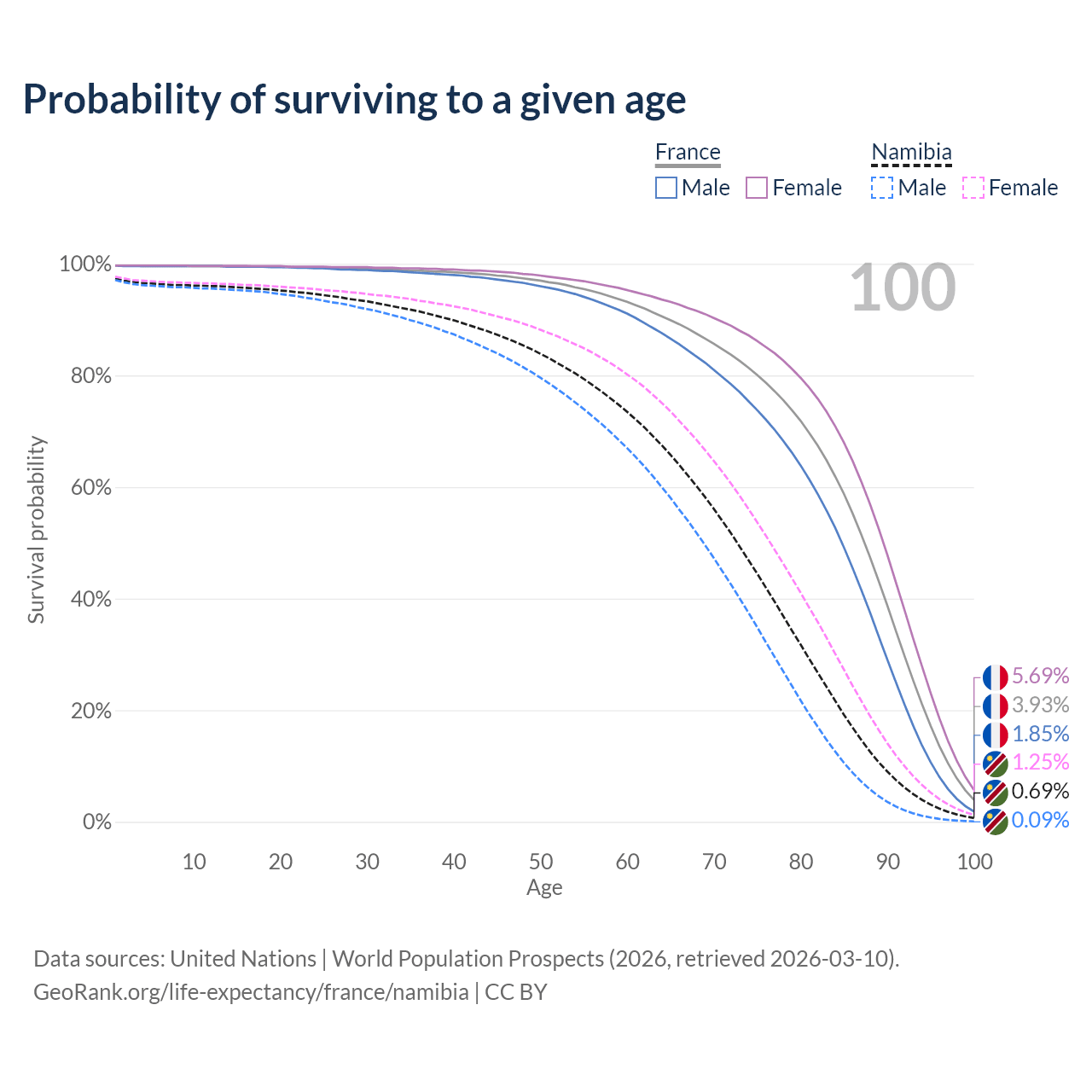 This life expectancy calculator shows the odds of living to 100, 95, 90, and below based on current age for both males and females in France and Namibia, along with mean and median age of death. The calculations are based on the 2026 life tables (actuarial tables) from the UN World Population Prospects.