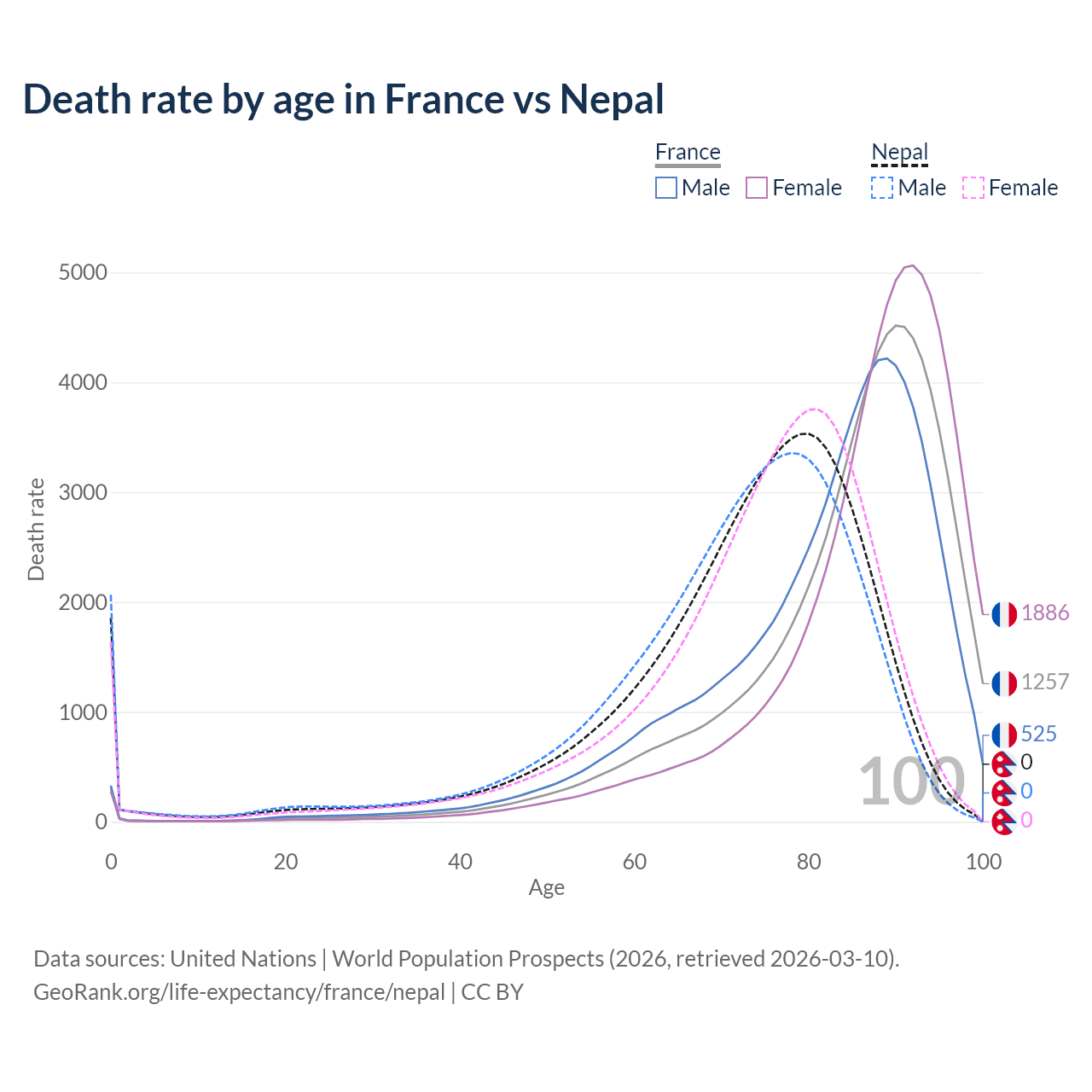Note that this chart does not show rates per 100,000 population, as those would be skewed by age structure differences and reflect the demographics of France and Nepal more than their death rates.