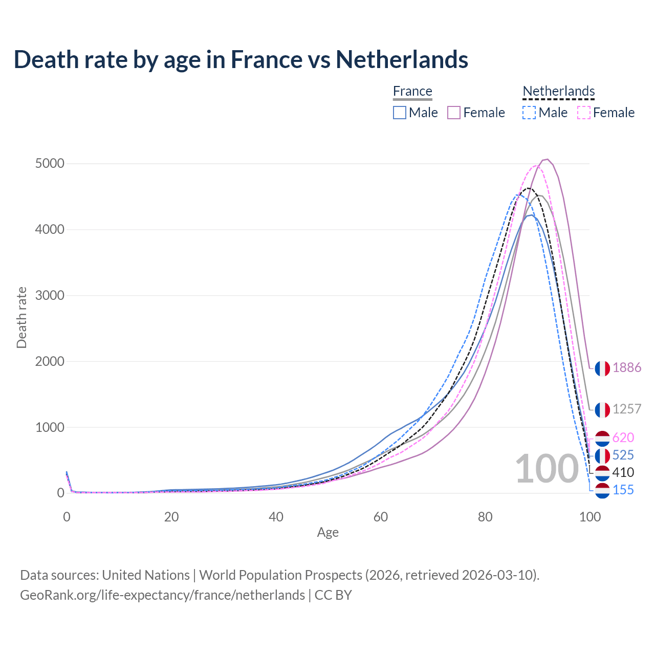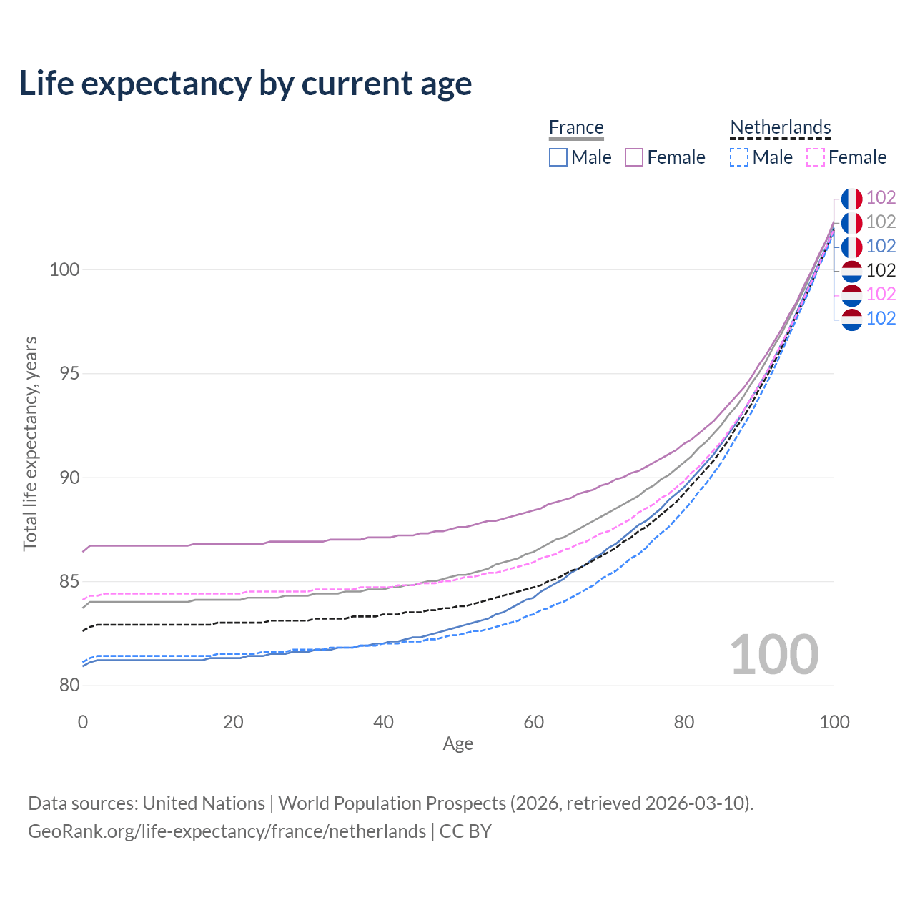 This life expectancy calculator shows the odds of living to 100, 95, 90, and below based on current age for both males and females in France and the Netherlands, along with mean and median age of death. The calculations are based on the 2026 life tables (actuarial tables) from the UN World Population Prospects.
