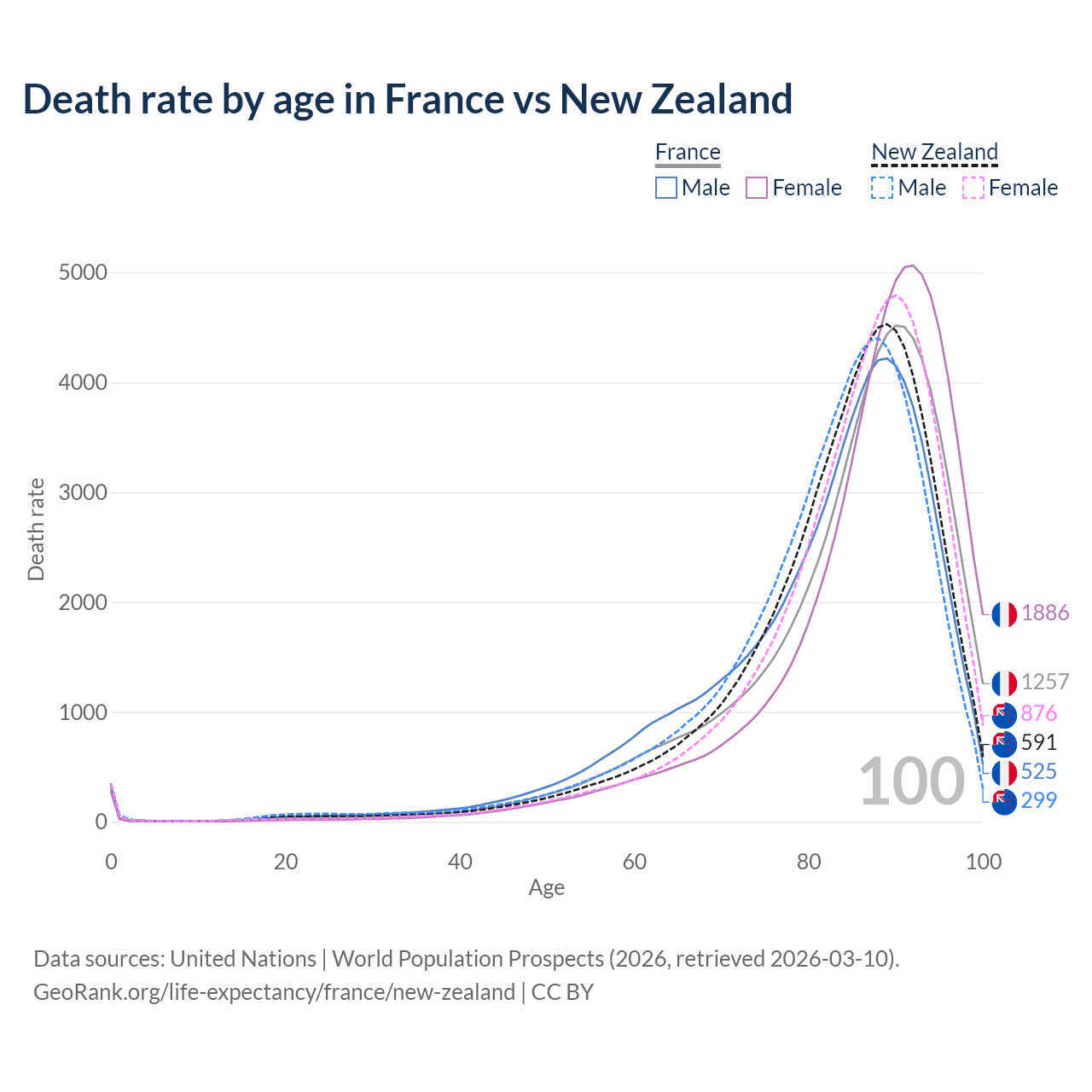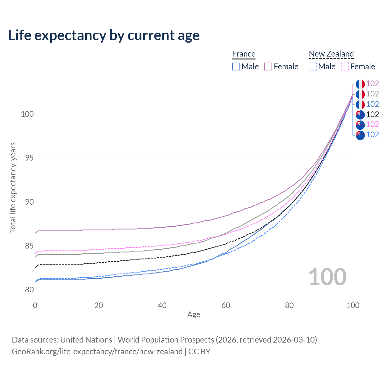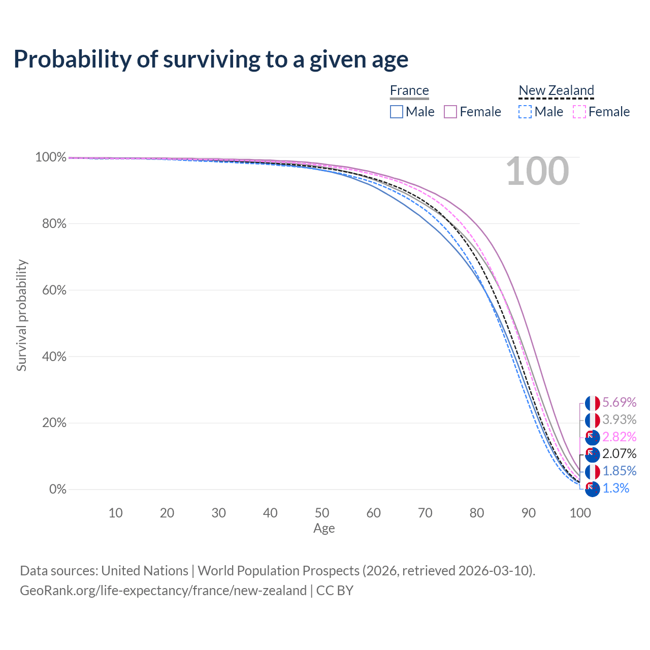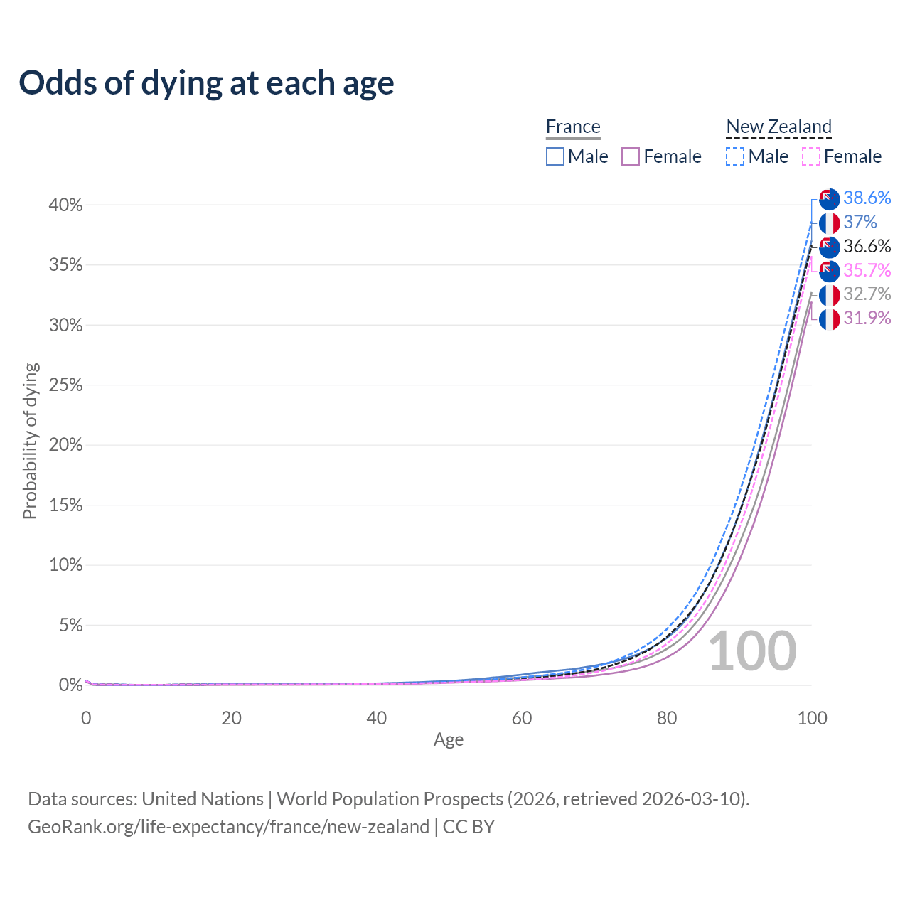 This life expectancy calculator shows the odds of living to 100, 95, 90, and below based on current age for both males and females in France and New Zealand, along with mean and median age of death. The calculations are based on the 2026 life tables (actuarial tables) from the UN World Population Prospects.