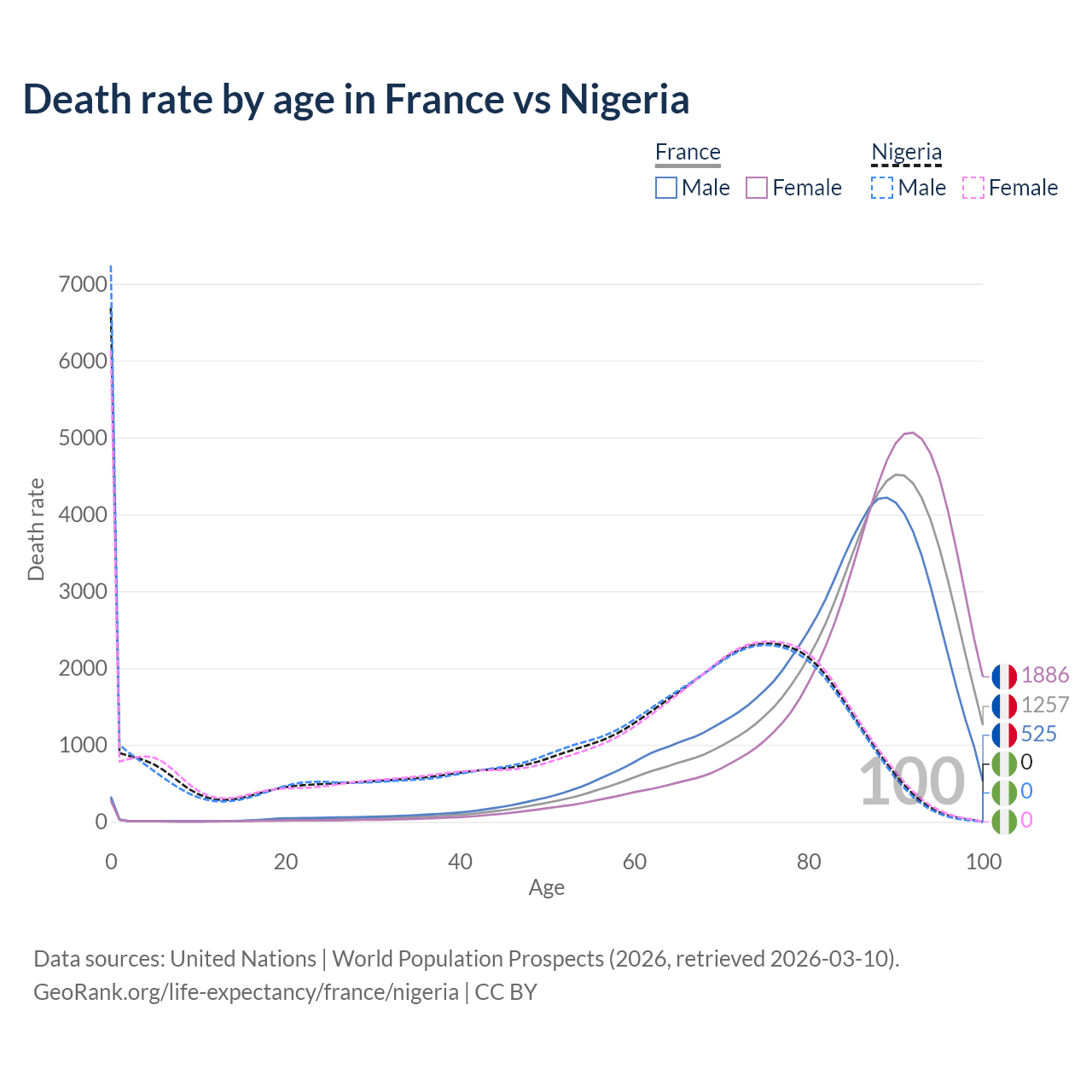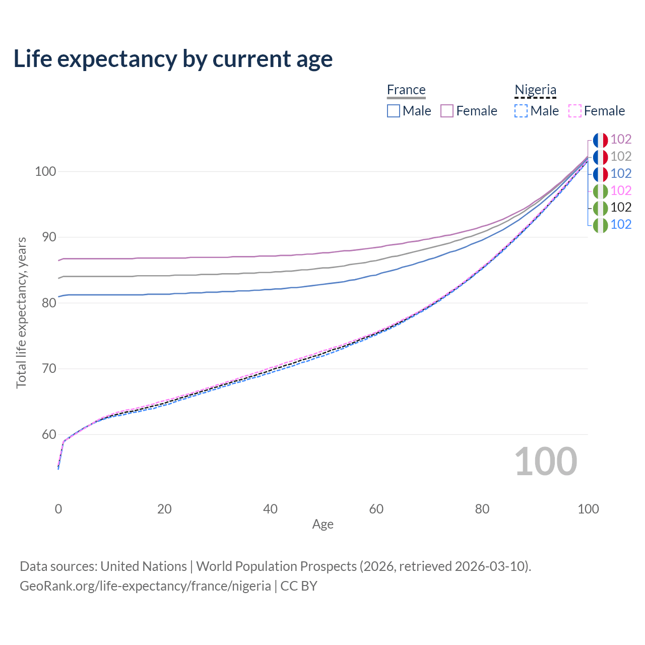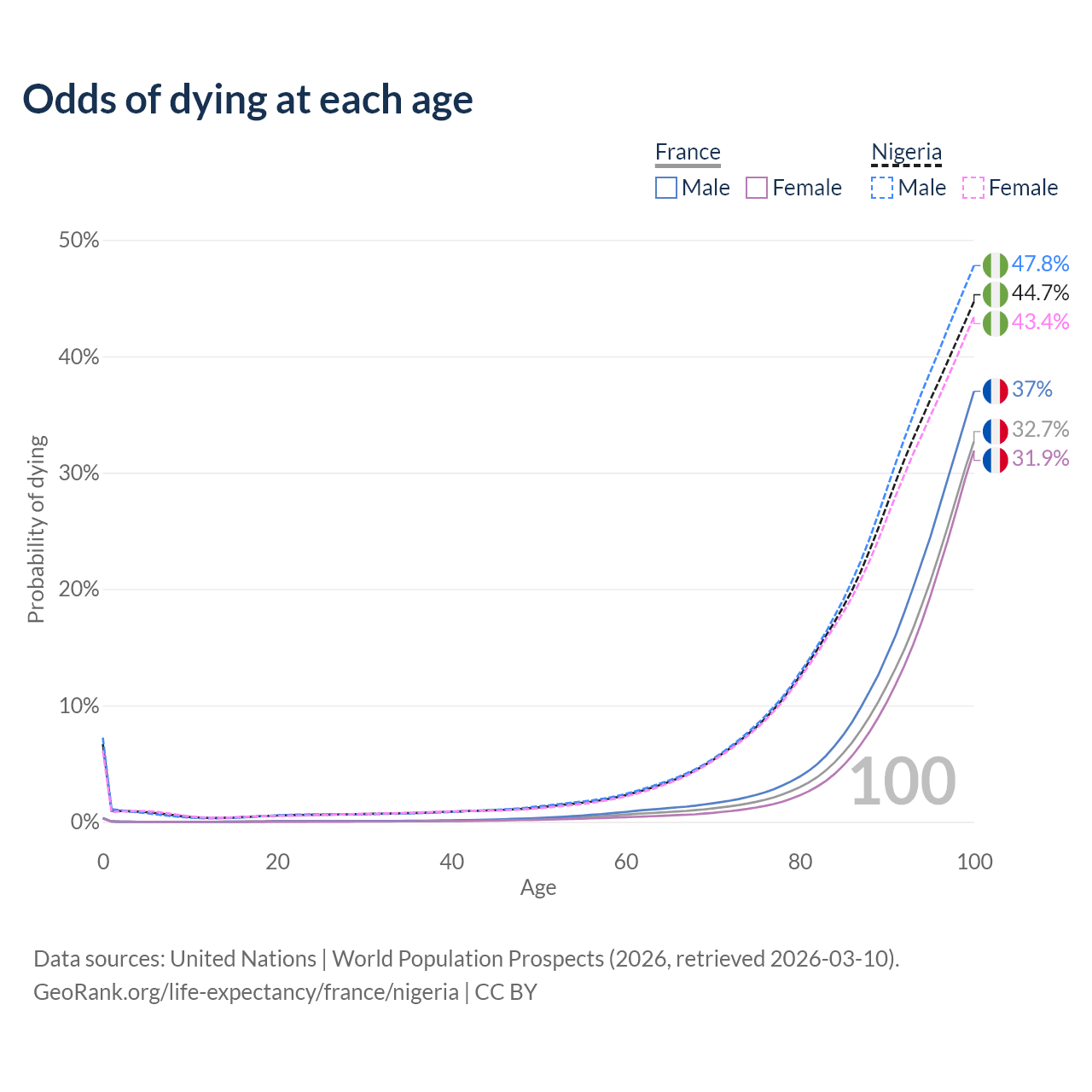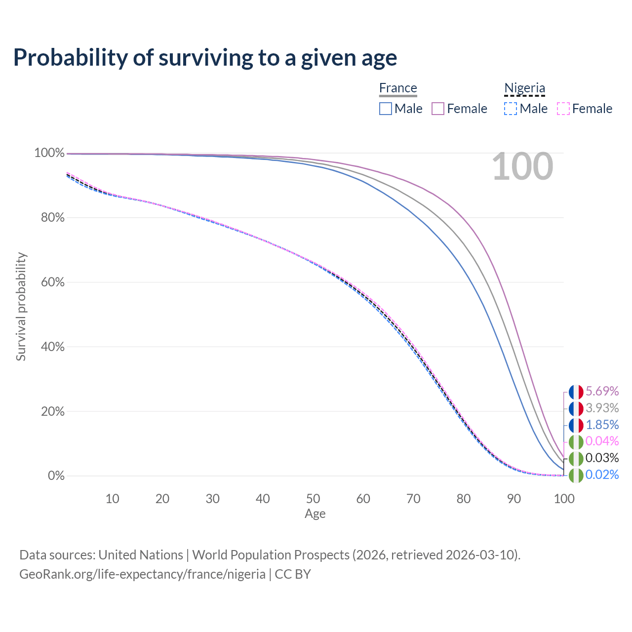This life expectancy calculator shows the odds of living to 100, 95, 90, and below based on current age for both males and females in France and Nigeria, along with mean and median age of death. The calculations are based on the 2026 life tables (actuarial tables) from the UN World Population Prospects.