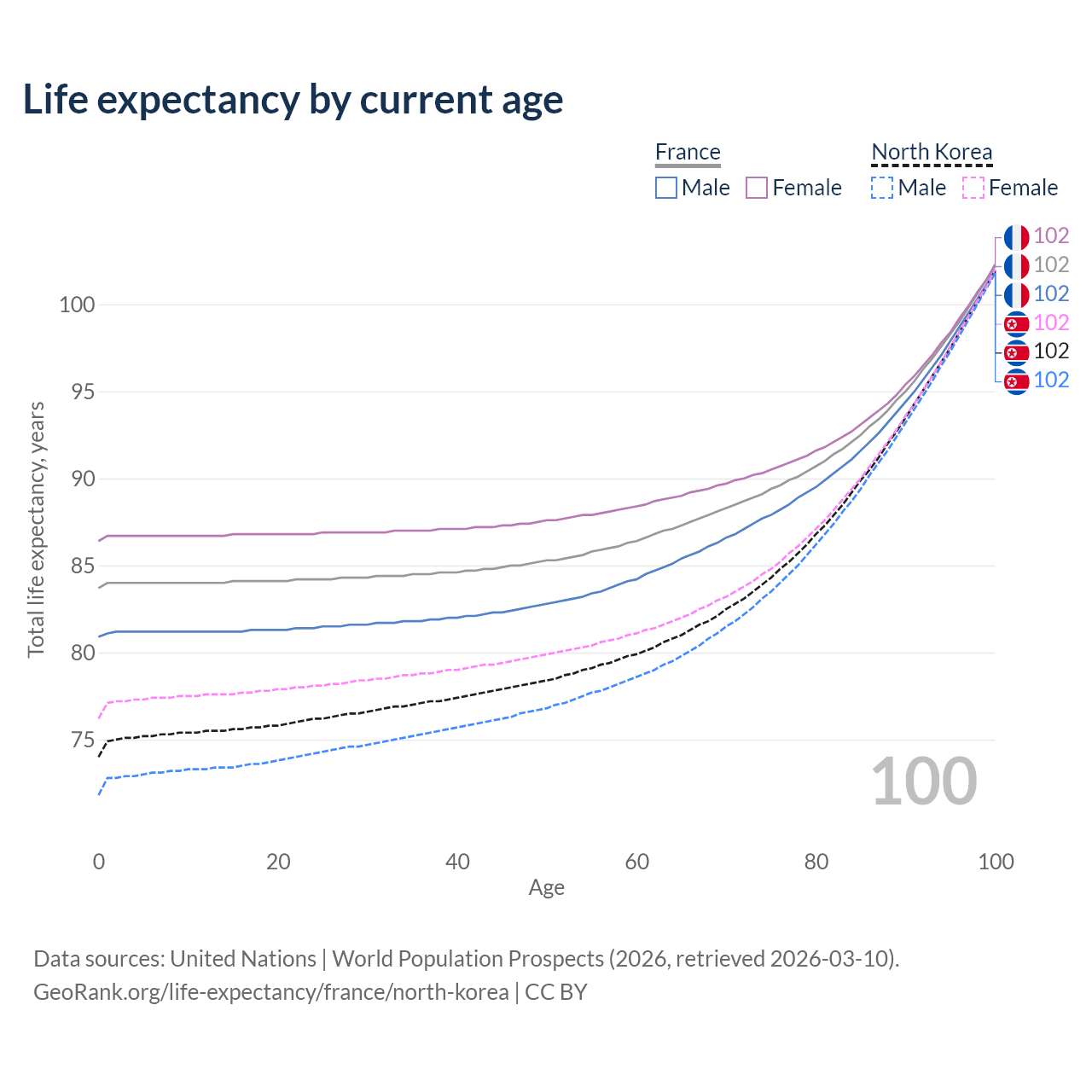 This life expectancy calculator shows the odds of living to 100, 95, 90, and below based on current age for both males and females in France and North Korea, along with mean and median age of death. The calculations are based on the 2026 life tables (actuarial tables) from the UN World Population Prospects.
