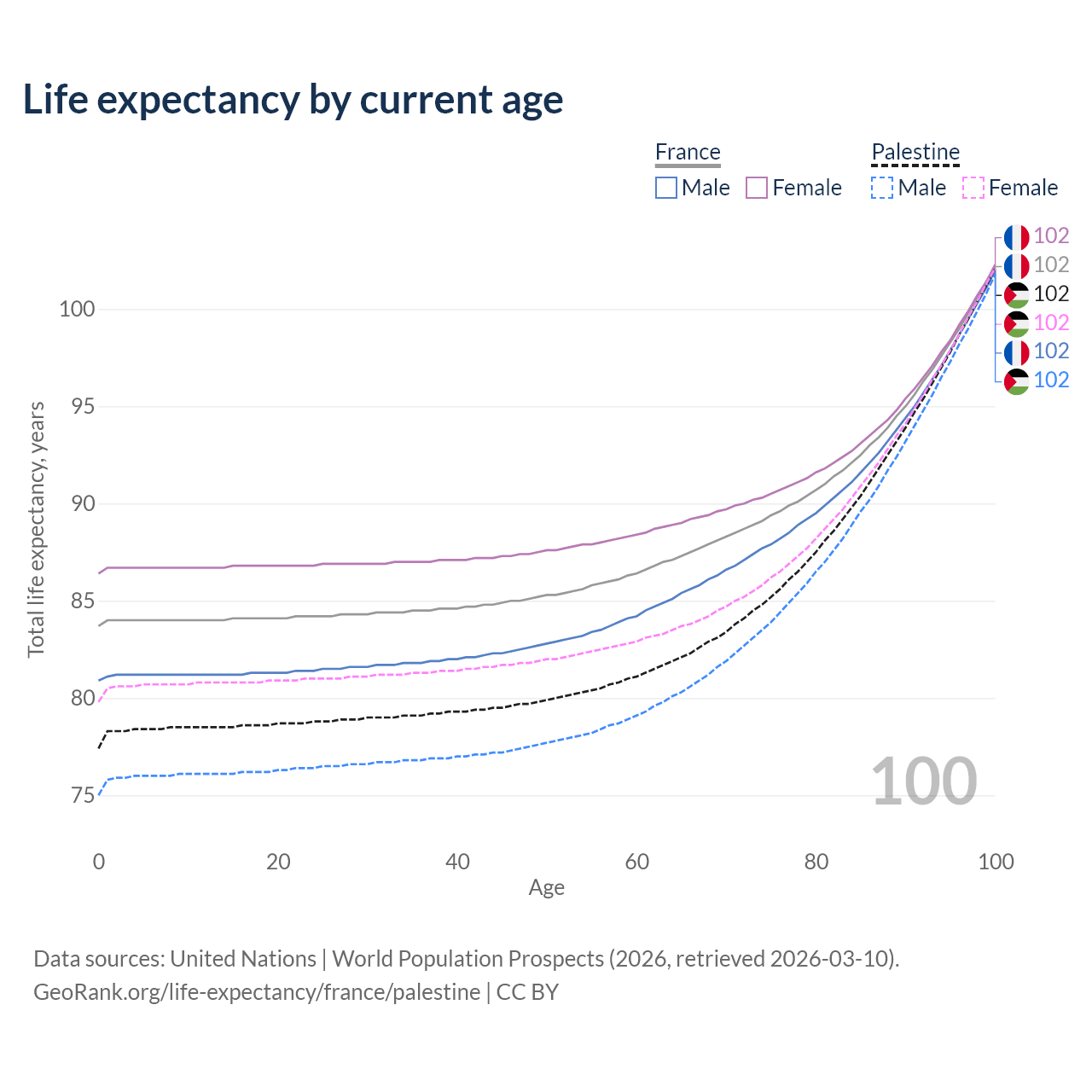 This life expectancy calculator shows the odds of living to 100, 95, 90, and below based on current age for both males and females in France and Palestine, along with mean and median age of death. The calculations are based on the 2026 life tables (actuarial tables) from the UN World Population Prospects.