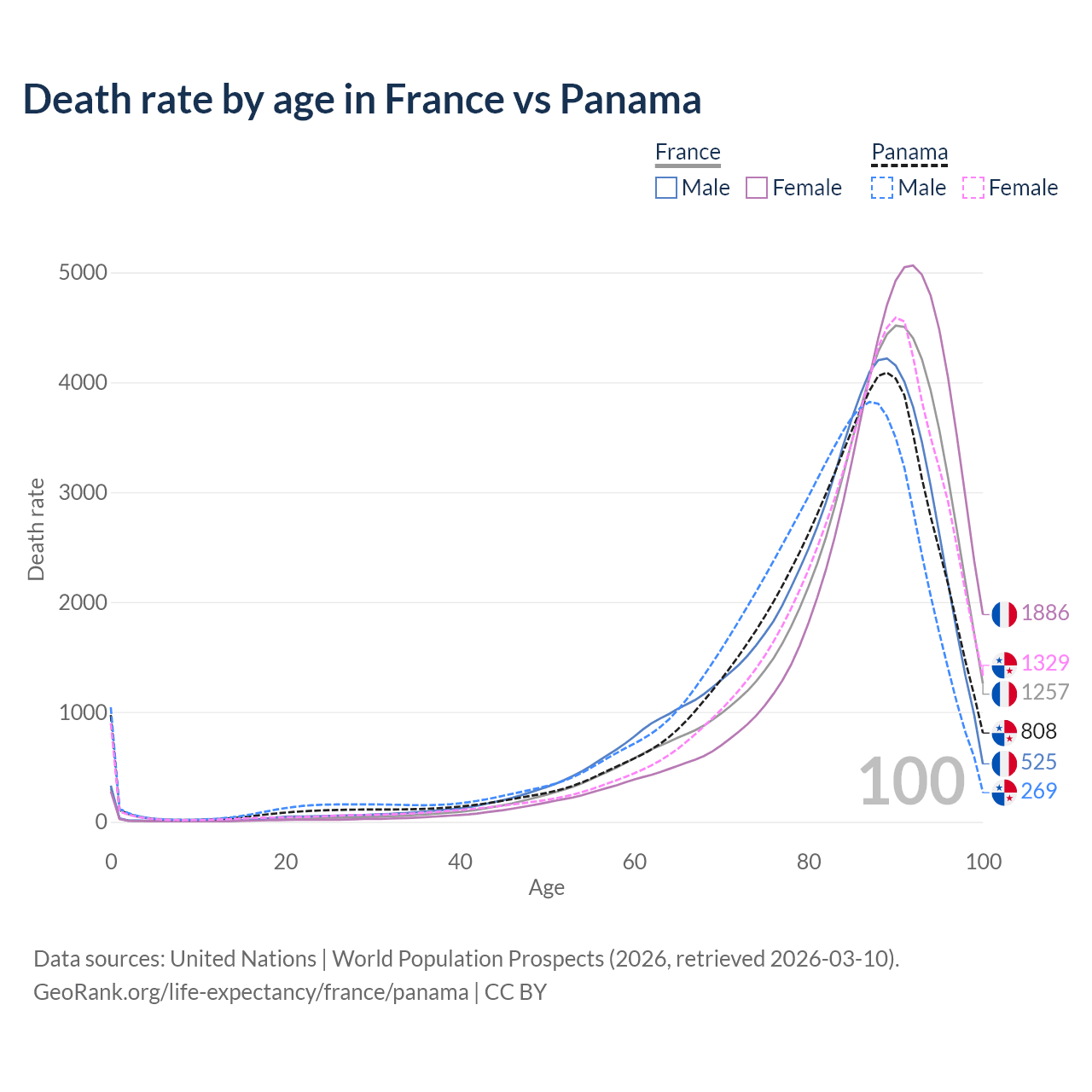 In France, the most common age of death is 90, compared to 89 in Panama. The median age of death is 87.4 in France and 84.6 in Panama, meaning only half of each cohort is expected to live past that age.
