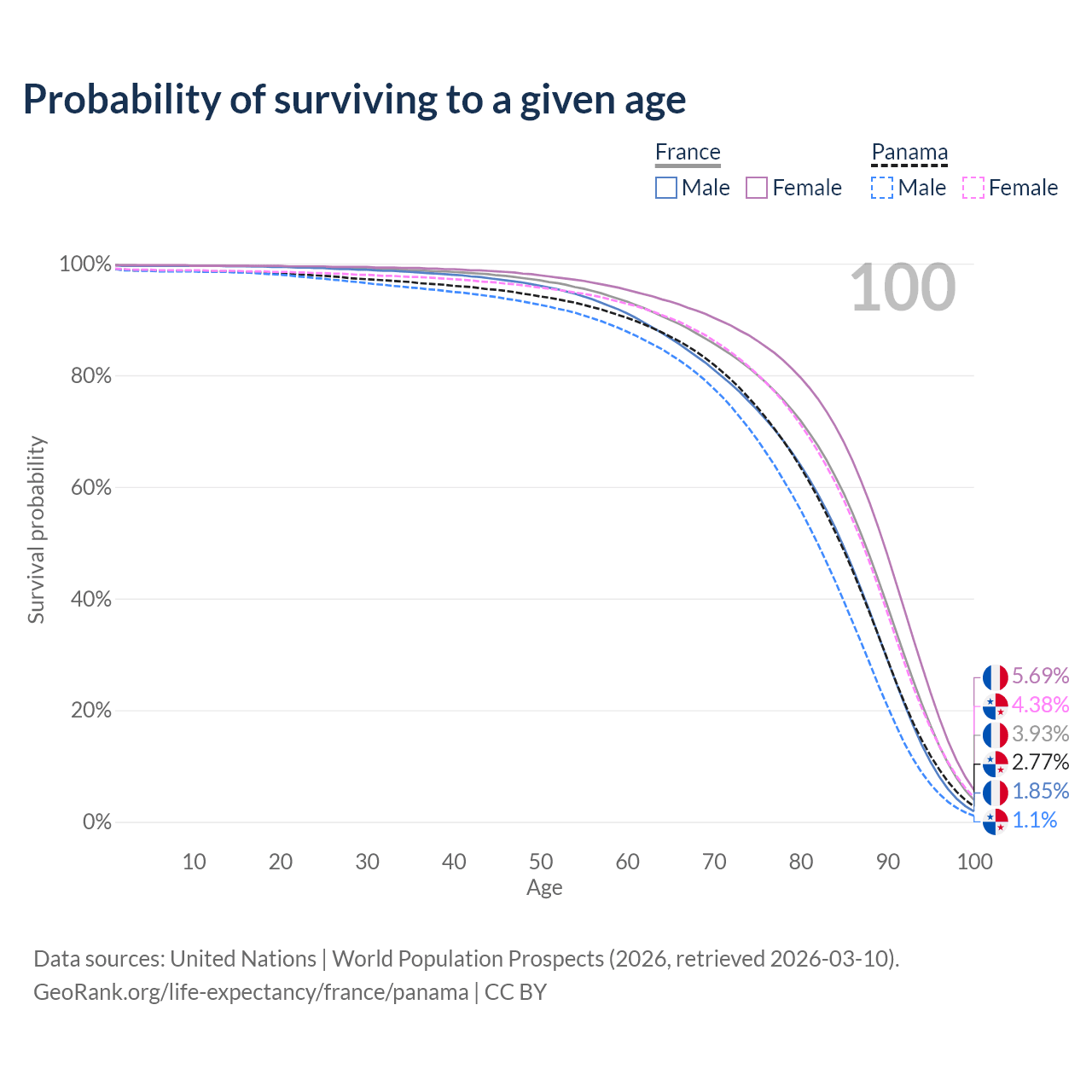 This life expectancy calculator shows the odds of living to 100, 95, 90, and below based on current age for both males and females in France and Panama, along with mean and median age of death. The calculations are based on the 2026 life tables (actuarial tables) from the UN World Population Prospects.