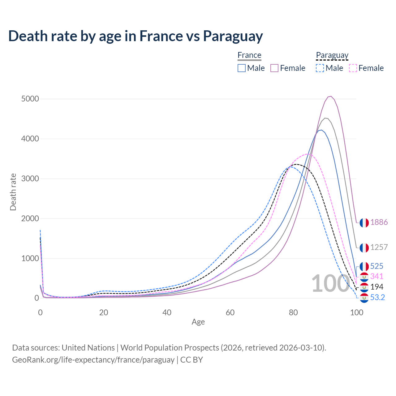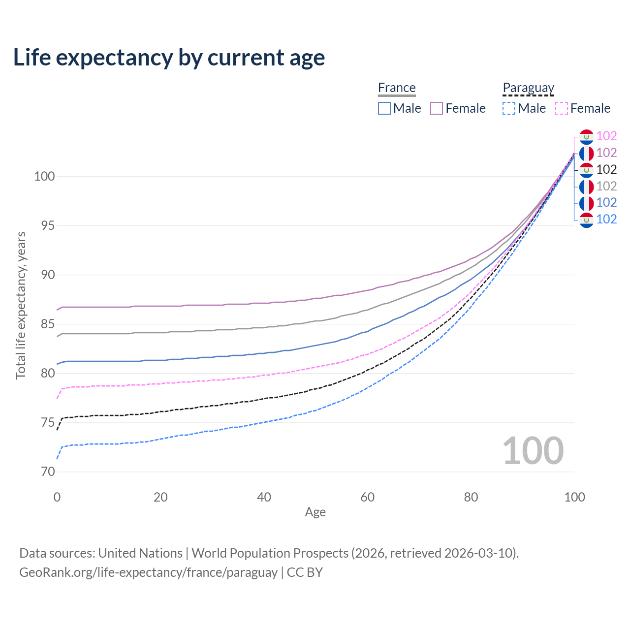 This life expectancy calculator shows the odds of living to 100, 95, 90, and below based on current age for both males and females in France and Paraguay, along with mean and median age of death. The calculations are based on the 2026 life tables (actuarial tables) from the UN World Population Prospects.