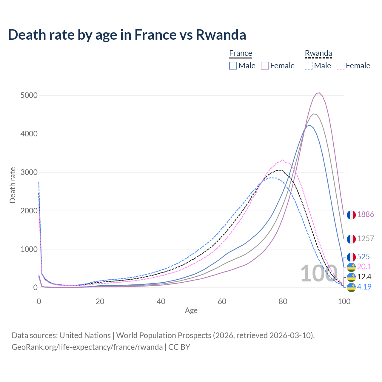 In France, the most common age of death is 90, compared to 78 in Rwanda. The median age of death is 87.4 in France and 73.5 in Rwanda, meaning only half of each cohort is expected to live past that age.
