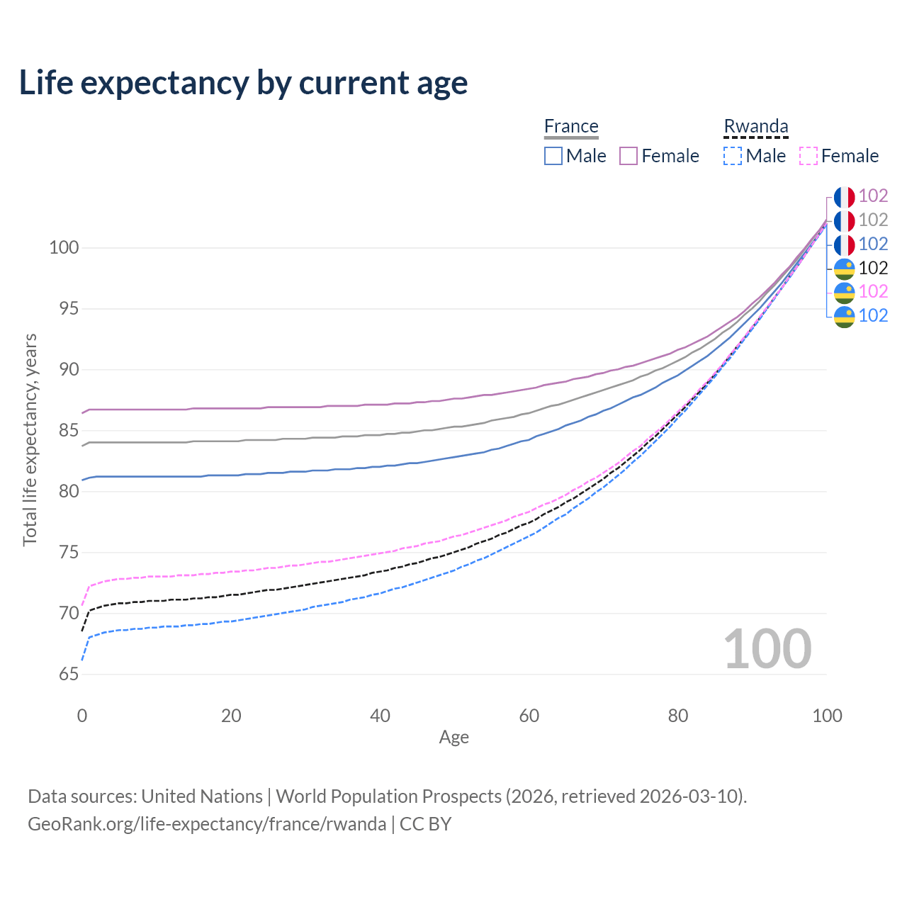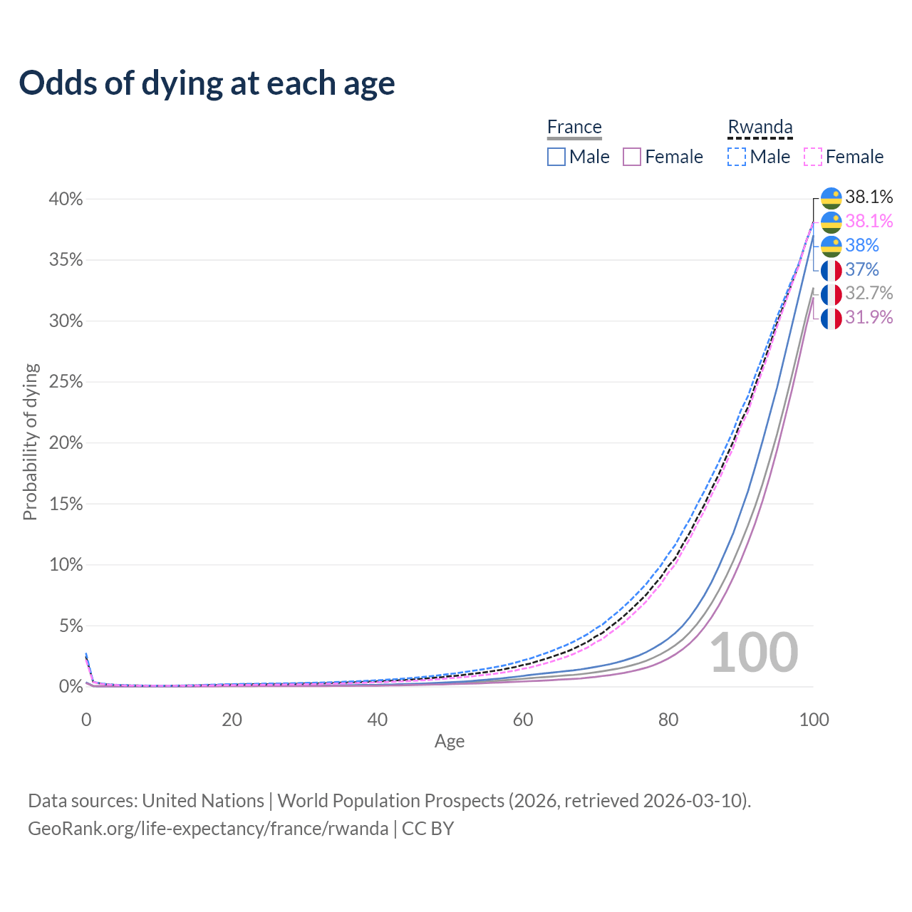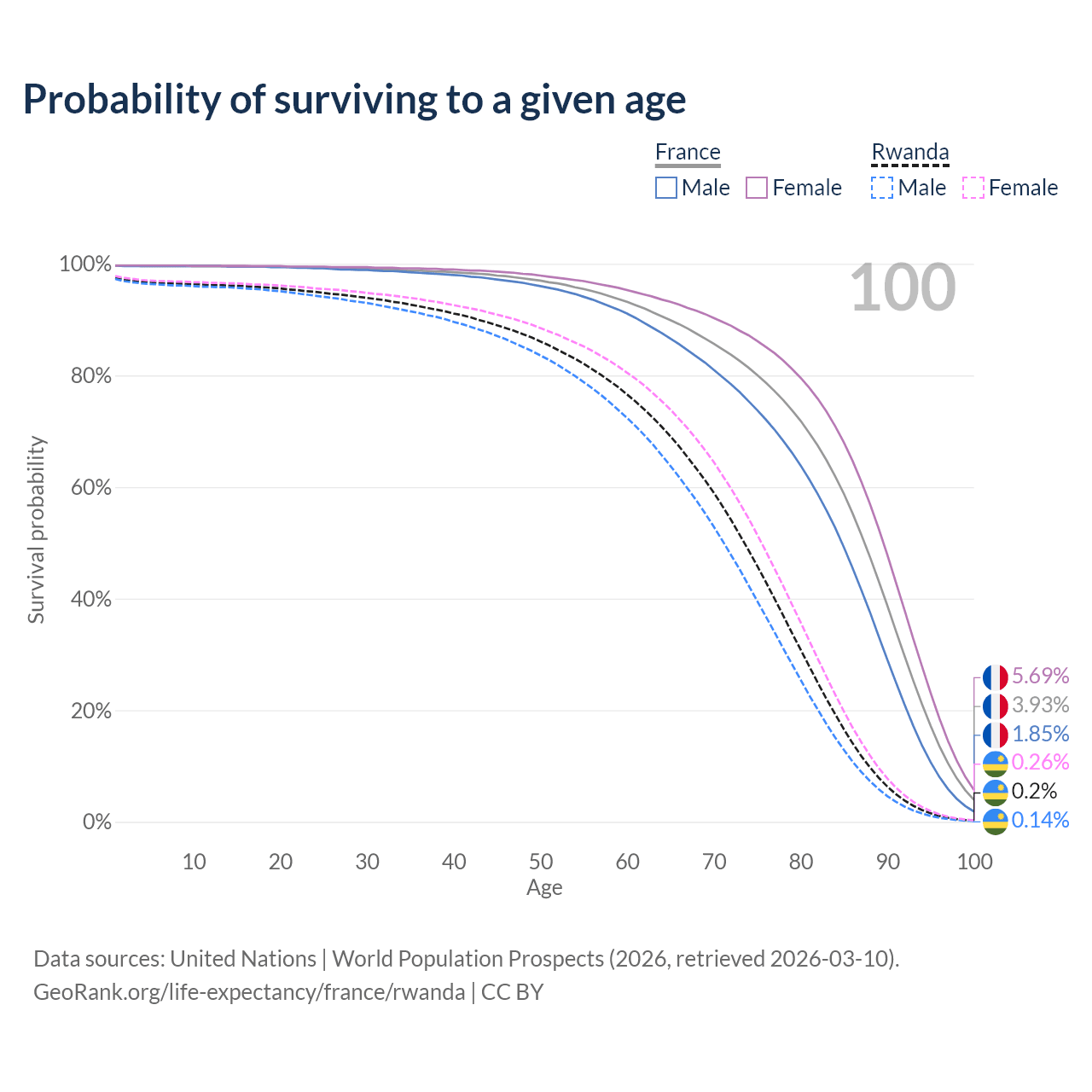 This life expectancy calculator shows the odds of living to 100, 95, 90, and below based on current age for both males and females in France and Rwanda, along with mean and median age of death. The calculations are based on the 2026 life tables (actuarial tables) from the UN World Population Prospects.