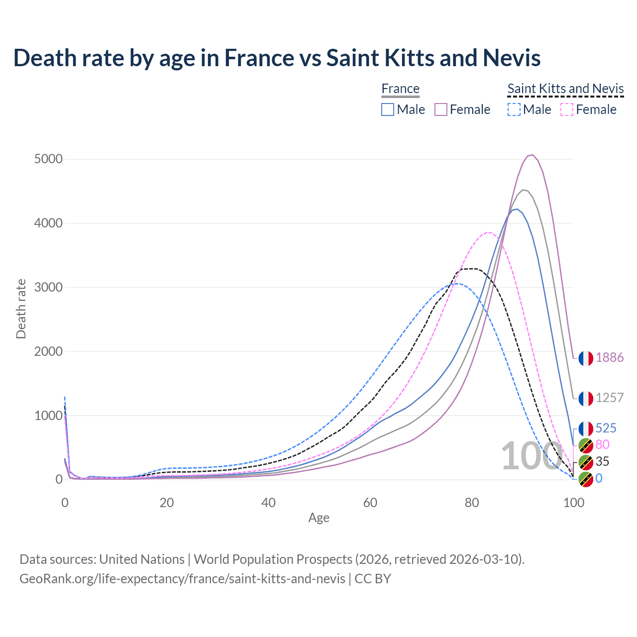 In France, the most common age of death is 90, compared to 80 in Saint Kitts and Nevis. The median age of death is 87.4 in France and 76.3 in Saint Kitts and Nevis, meaning only half of each cohort is expected to live past that age.