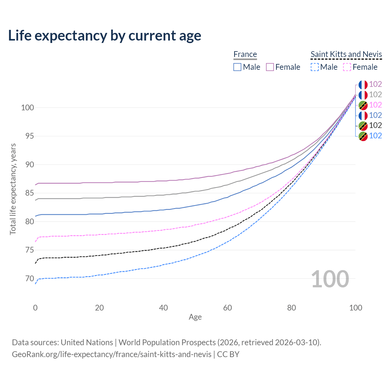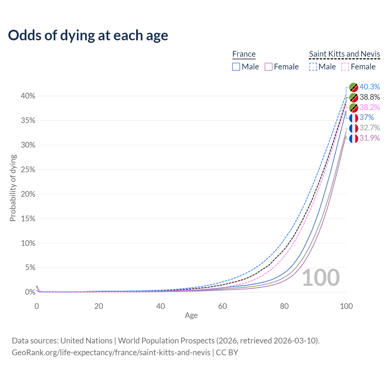 This life expectancy calculator shows the odds of living to 100, 95, 90, and below based on current age for both males and females in France and Saint Kitts and Nevis, along with mean and median age of death. The calculations are based on the 2026 life tables (actuarial tables) from the UN World Population Prospects.