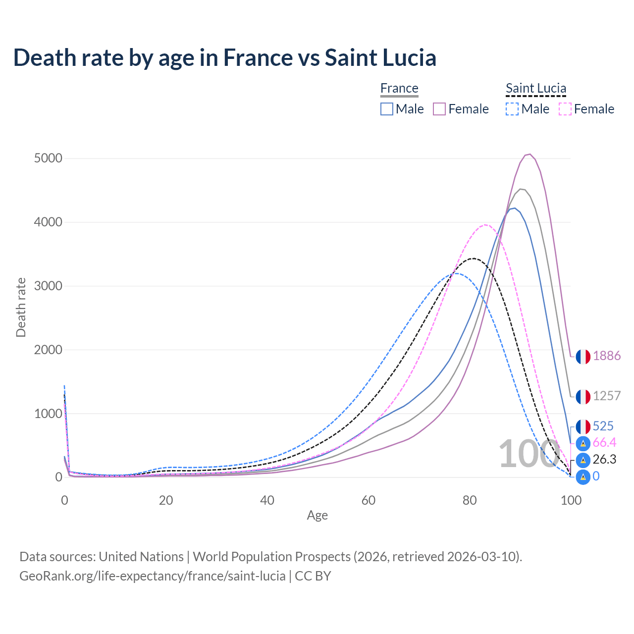 In France, the most common age of death is 90, compared to 81 in Saint Lucia. The median age of death is 87.4 in France and 76.8 in Saint Lucia, meaning only half of each cohort is expected to live past that age.