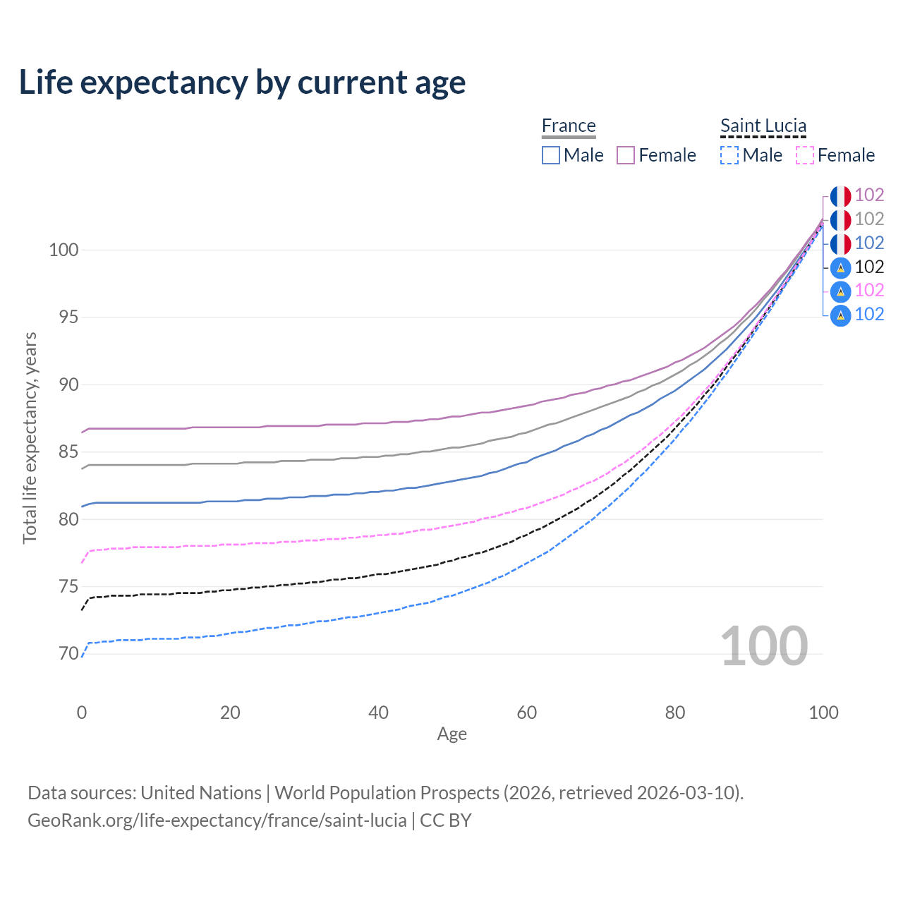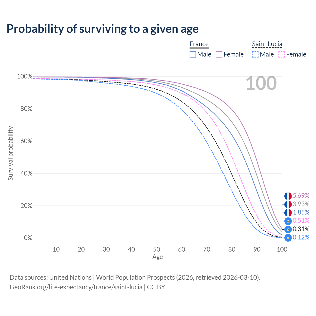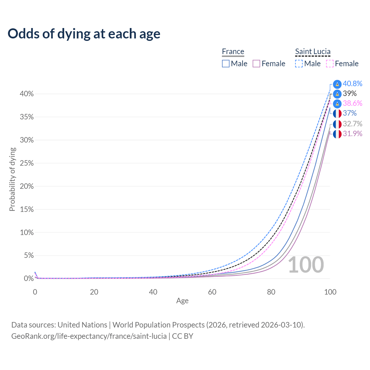 This life expectancy calculator shows the odds of living to 100, 95, 90, and below based on current age for both males and females in France and Saint Lucia, along with mean and median age of death. The calculations are based on the 2026 life tables (actuarial tables) from the UN World Population Prospects.