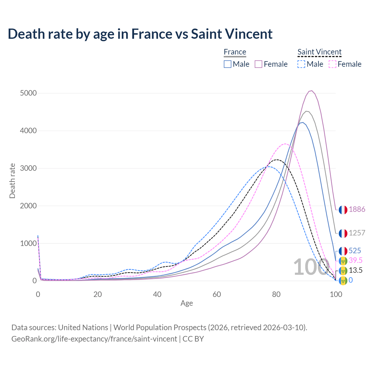 In France, the most common age of death is 90, compared to 80 in Saint Vincent. The median age of death is 87.4 in France and 75.6 in Saint Vincent, meaning only half of each cohort is expected to live past that age.