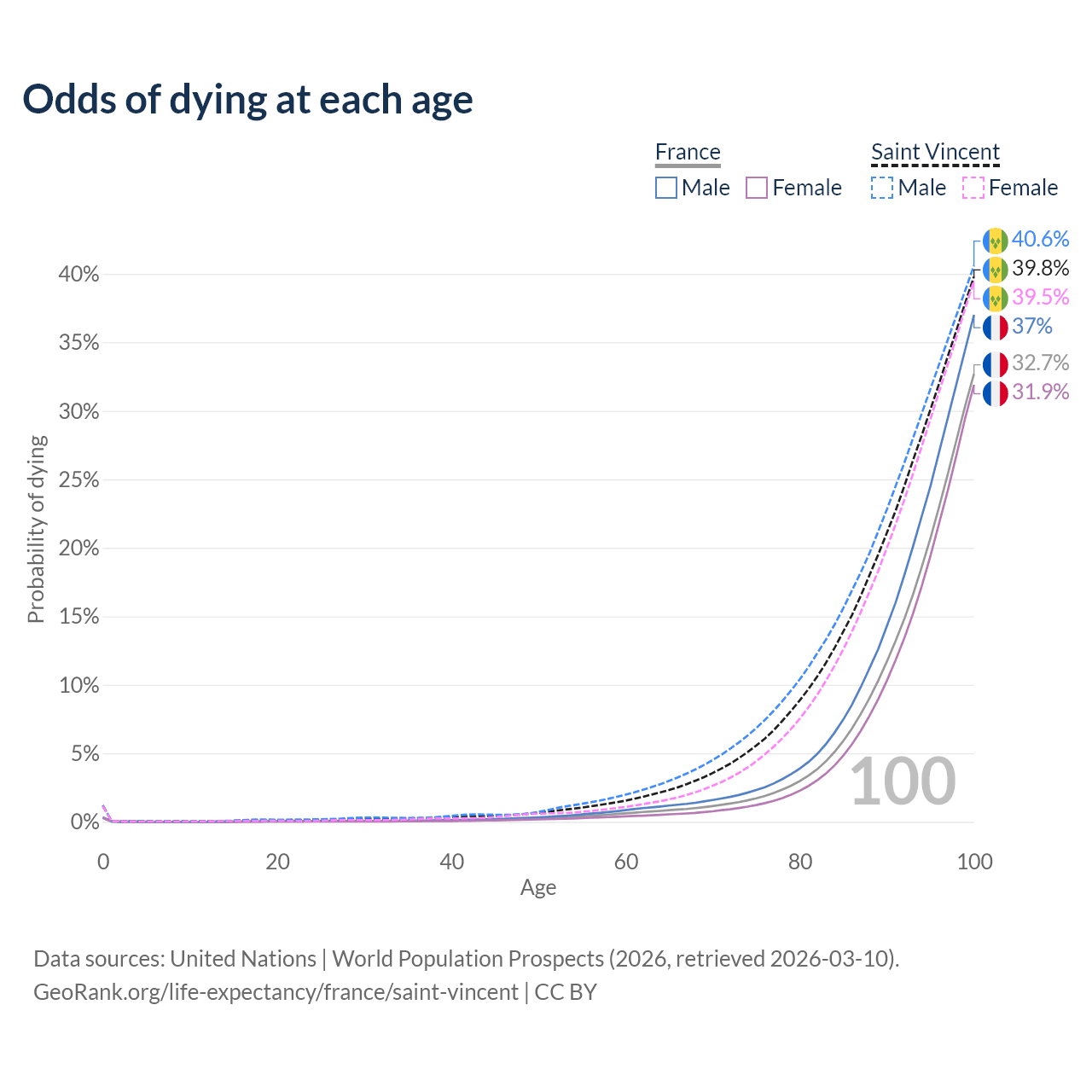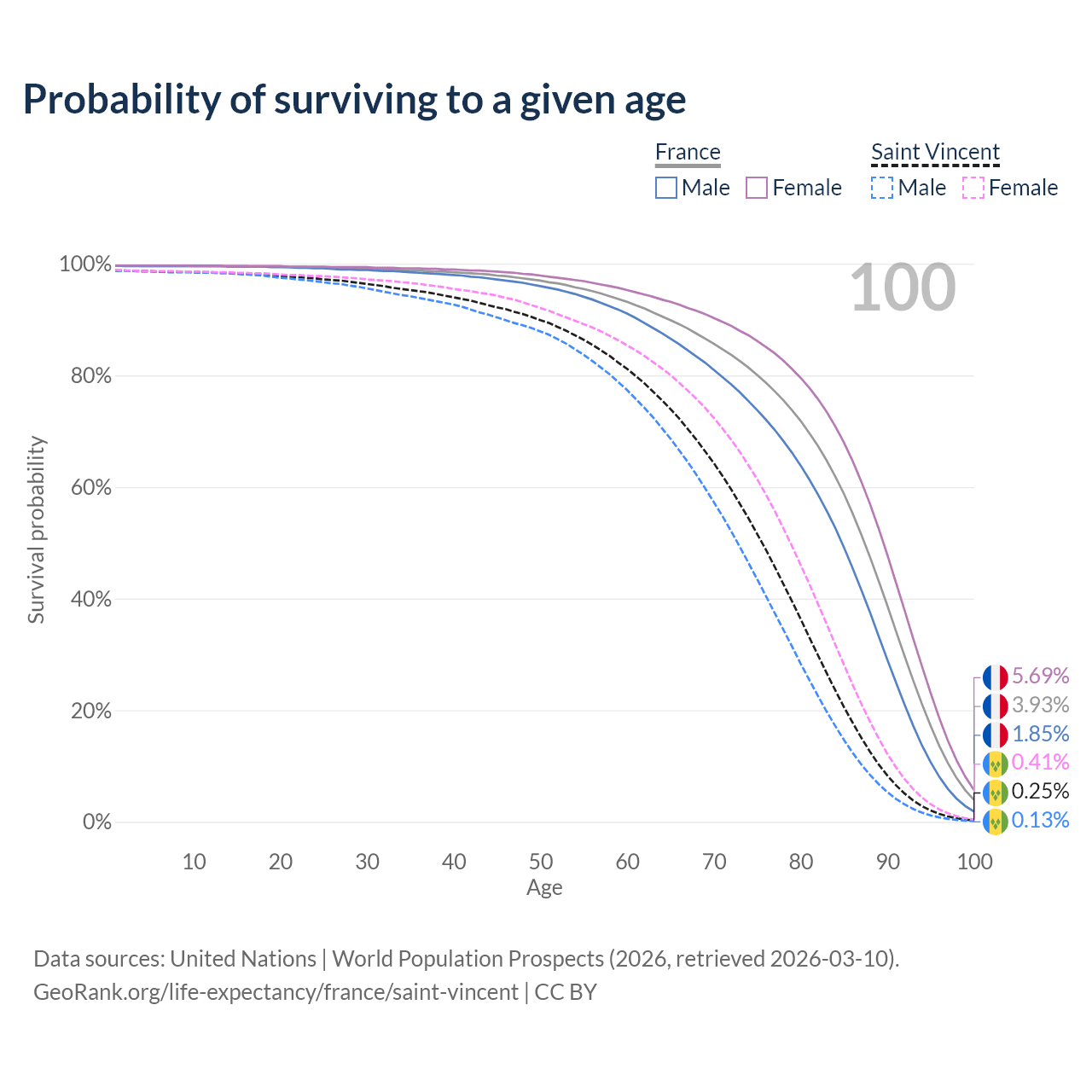 This life expectancy calculator shows the odds of living to 100, 95, 90, and below based on current age for both males and females in France and Saint Vincent, along with mean and median age of death. The calculations are based on the 2026 life tables (actuarial tables) from the UN World Population Prospects.