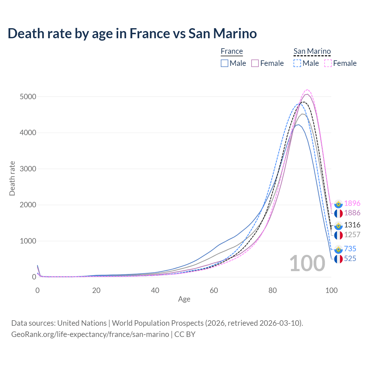 In France, the most common age of death is 90, compared to 91 in San Marino. The median age of death is 87.4 in France and 88.3 in San Marino, meaning only half of each cohort is expected to live past that age.