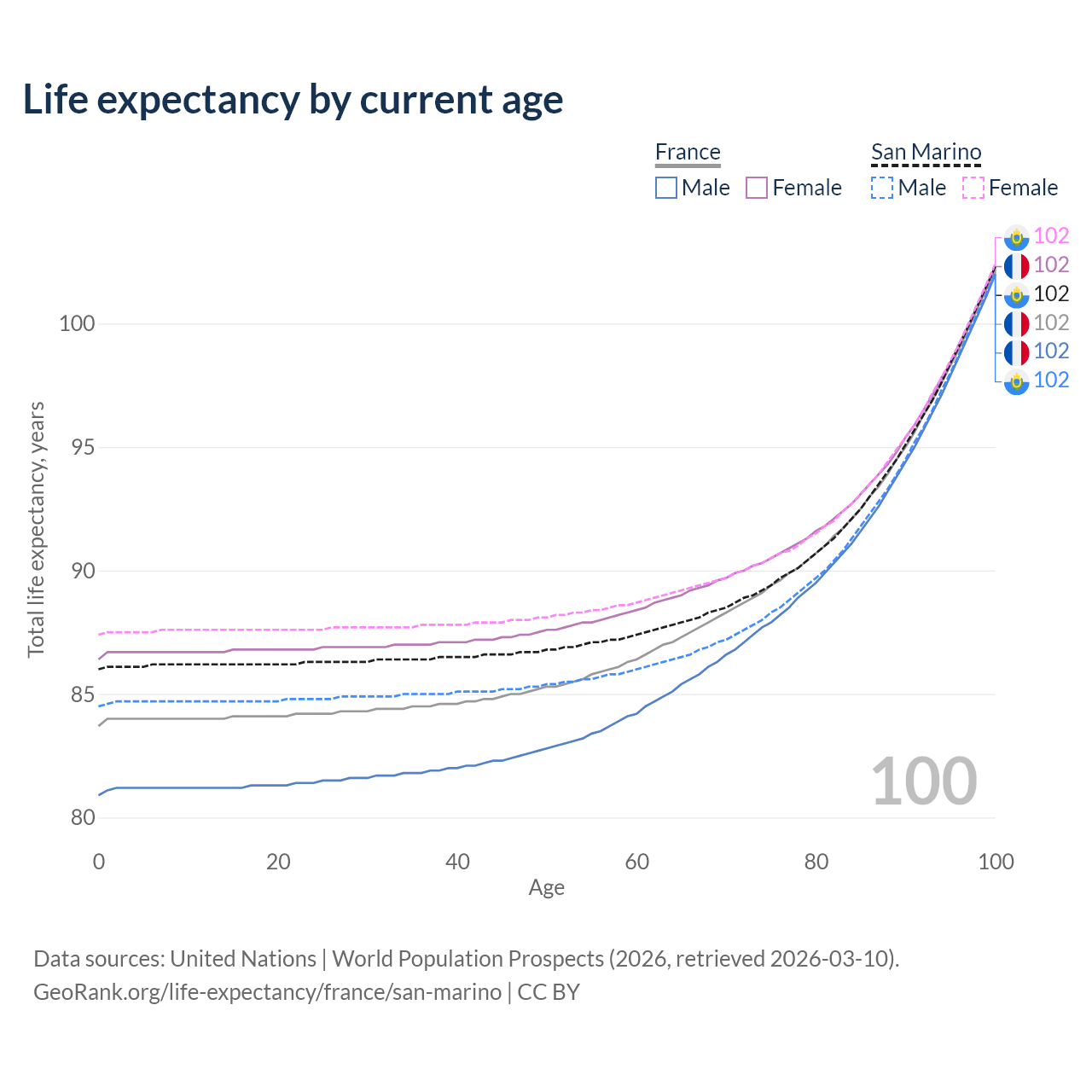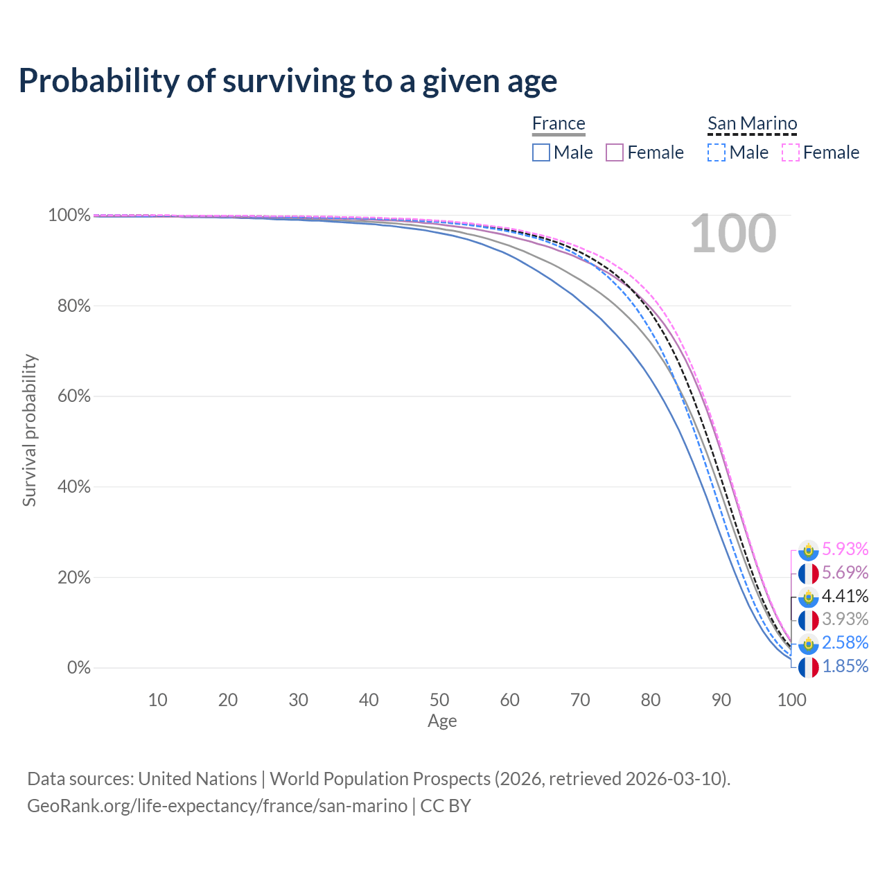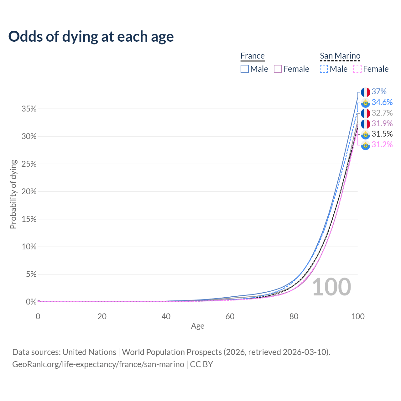 This life expectancy calculator shows the odds of living to 100, 95, 90, and below based on current age for both males and females in France and San Marino, along with mean and median age of death. The calculations are based on the 2026 life tables (actuarial tables) from the UN World Population Prospects.