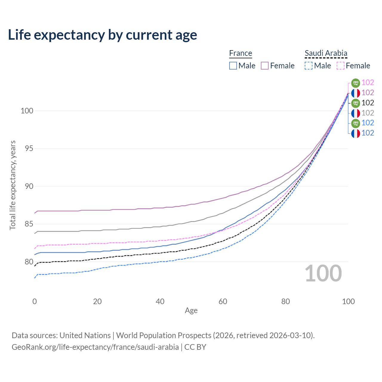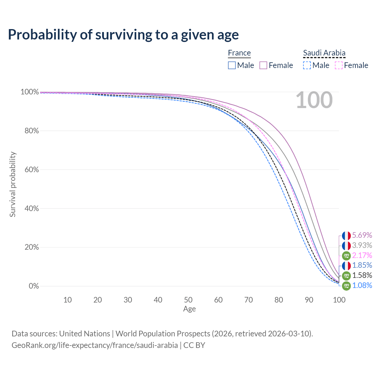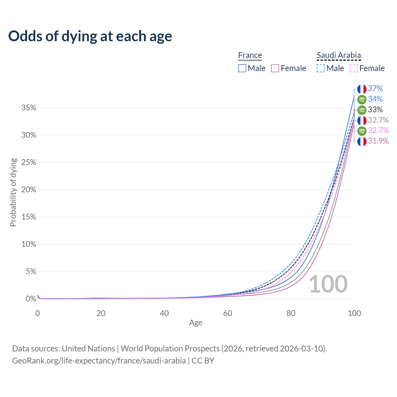 This life expectancy calculator shows the odds of living to 100, 95, 90, and below based on current age for both males and females in France and Saudi Arabia, along with mean and median age of death. The calculations are based on the 2026 life tables (actuarial tables) from the UN World Population Prospects.