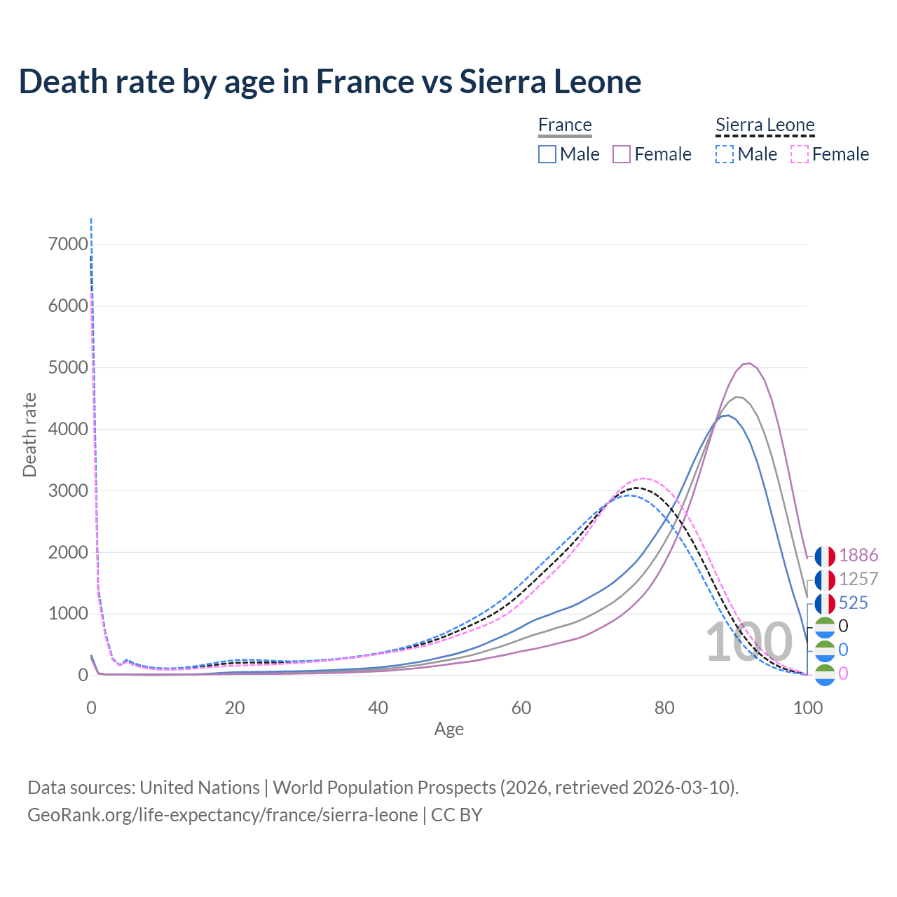 In France, the most common age of death is 90, compared to 0 in Sierra Leone. The median age of death is 87.4 in France and 70.8 in Sierra Leone, meaning only half of each cohort is expected to live past that age.