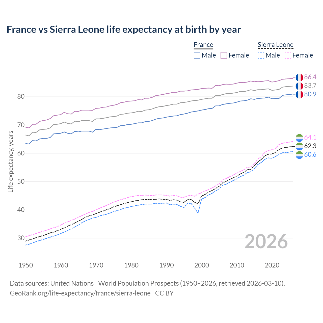 The average life expectancy at birth is 83.7 years in France vs 62.3 in Sierra Leone. France is ranked 15/197 by life expectancy, and Sierra Leone is 186/197. In France, the life expectancy is 80.9 years for males and 86.4 years for females. In Sierra Leone, it's 60.6 years for males and 64.1 years for females.