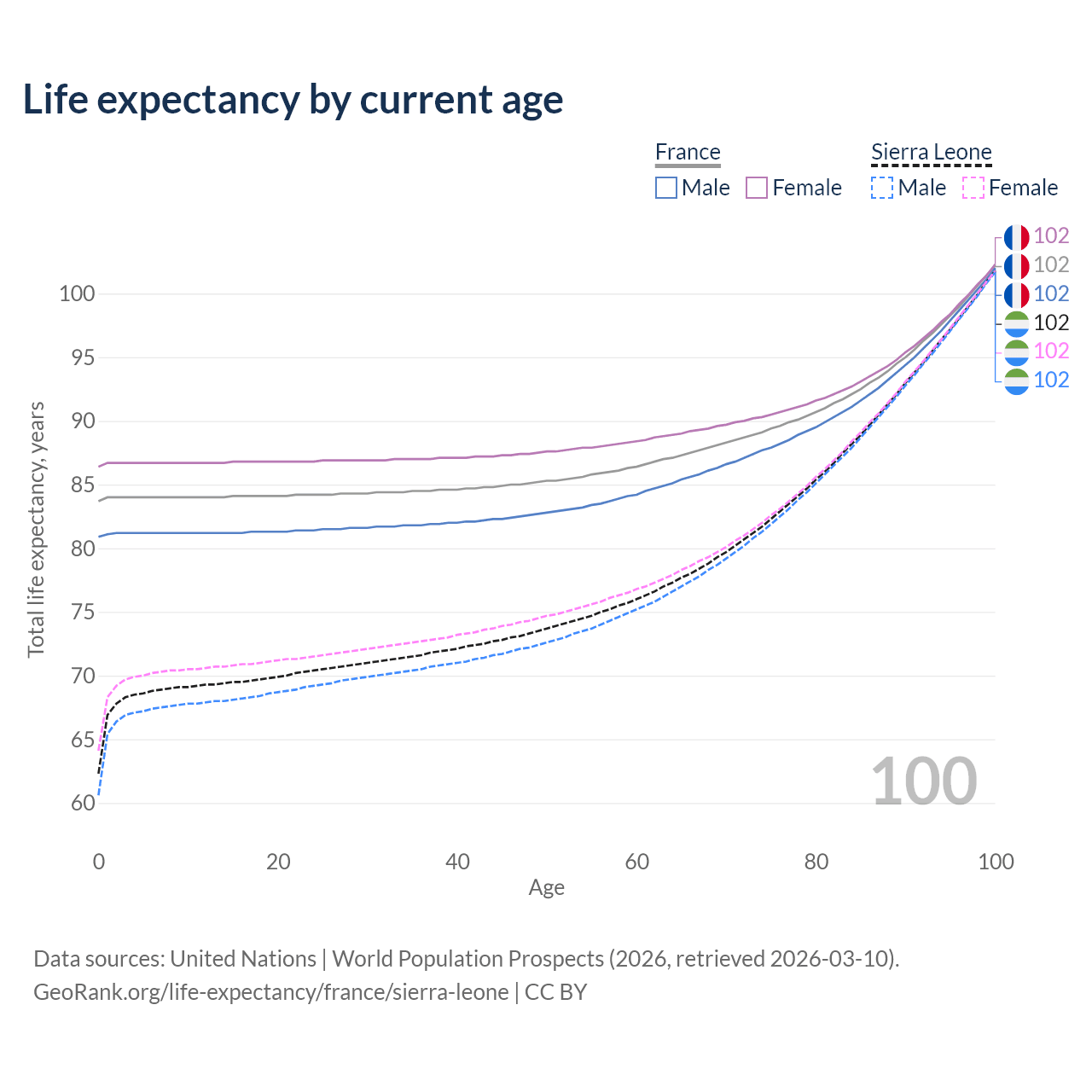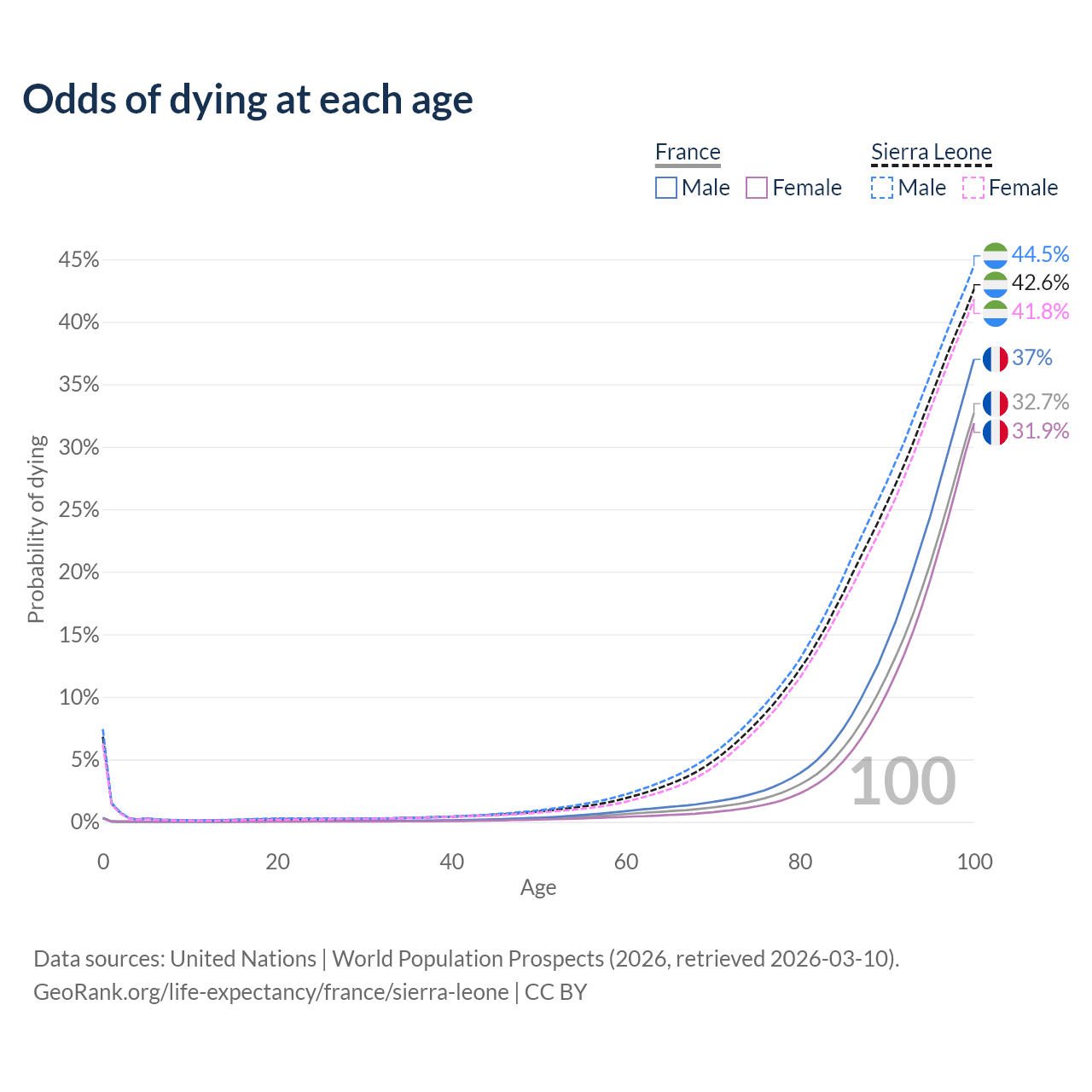 This life expectancy calculator shows the odds of living to 100, 95, 90, and below based on current age for both males and females in France and Sierra Leone, along with mean and median age of death. The calculations are based on the 2026 life tables (actuarial tables) from the UN World Population Prospects.