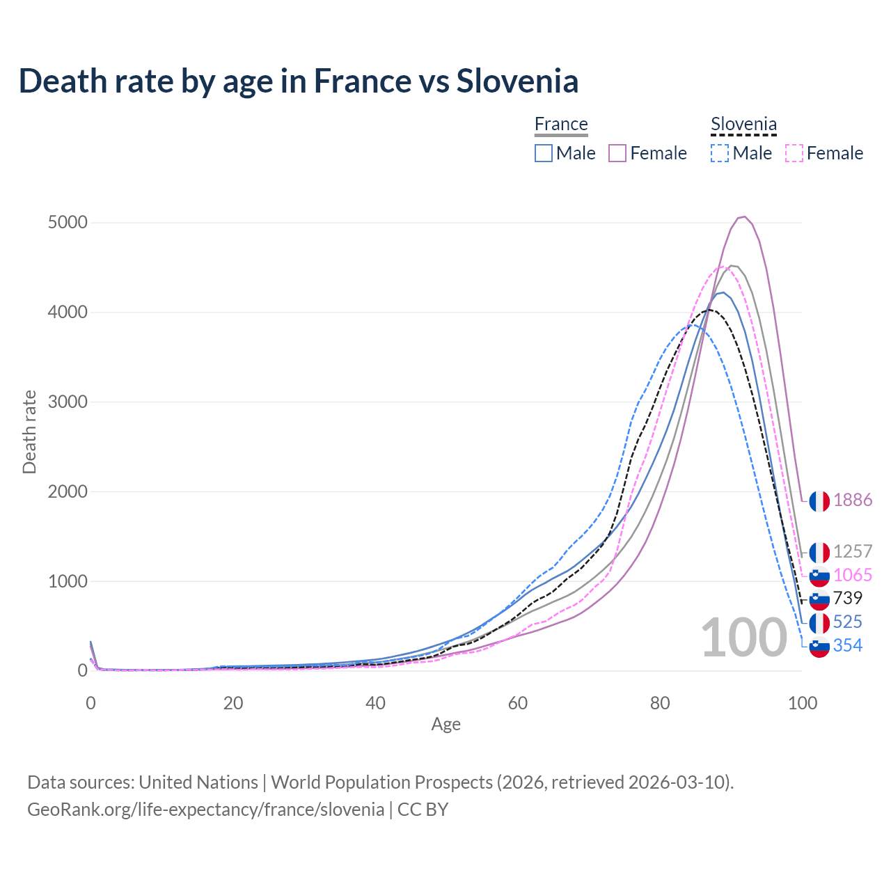 In France, the most common age of death is 90, compared to 87 in Slovenia. The median age of death is 87.4 in France and 84.4 in Slovenia, meaning only half of each cohort is expected to live past that age.