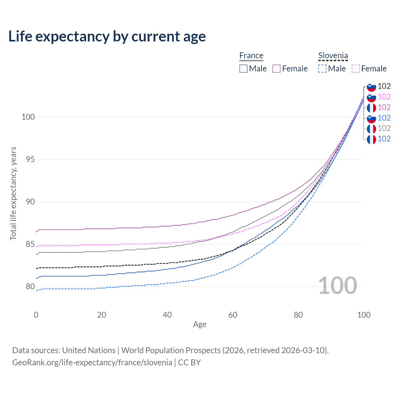 This life expectancy calculator shows the odds of living to 100, 95, 90, and below based on current age for both males and females in France and Slovenia, along with mean and median age of death. The calculations are based on the 2026 life tables (actuarial tables) from the UN World Population Prospects.