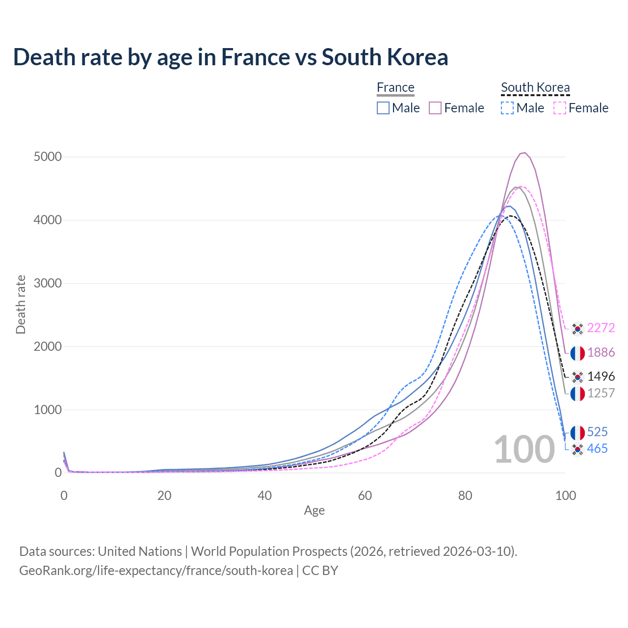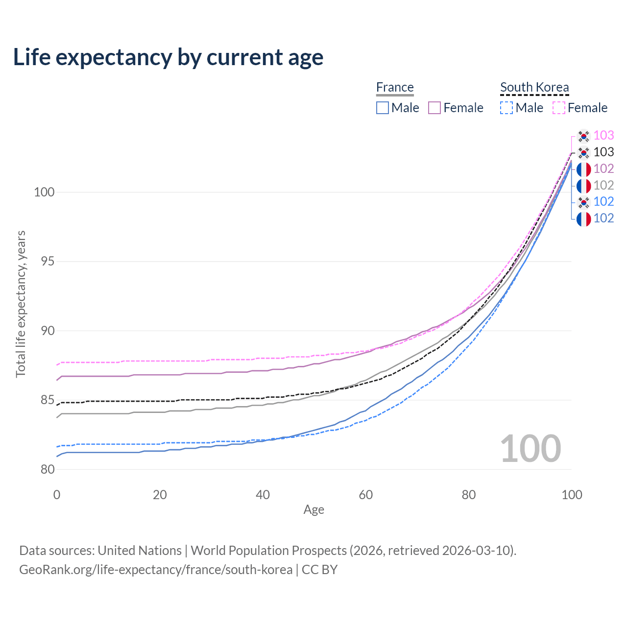 This life expectancy calculator shows the odds of living to 100, 95, 90, and below based on current age for both males and females in France and South Korea, along with mean and median age of death. The calculations are based on the 2026 life tables (actuarial tables) from the UN World Population Prospects.